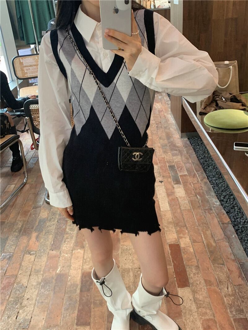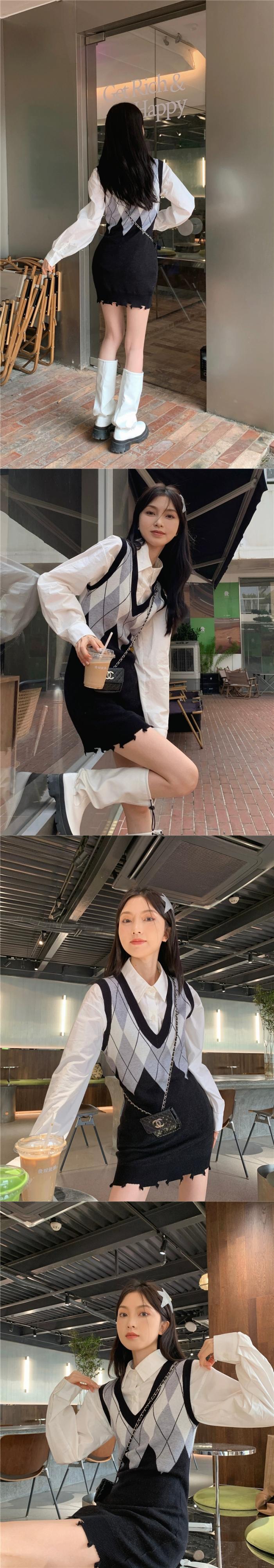 アメリカの菱形ニットベストドレス女性春 2023 新しいレトロ V ネックスリムスリムスカート スプリング 春物 Vネック 0921995730036844