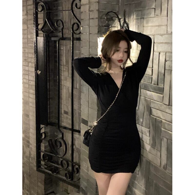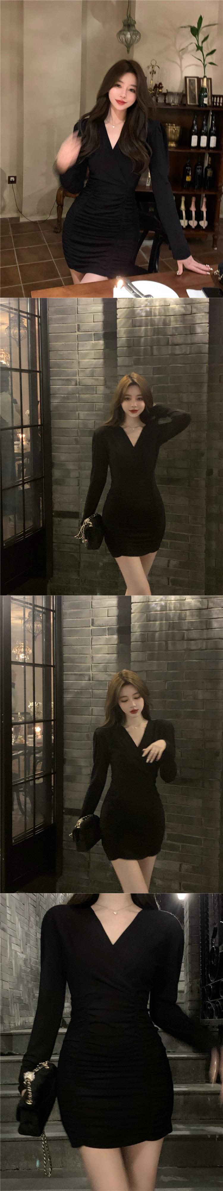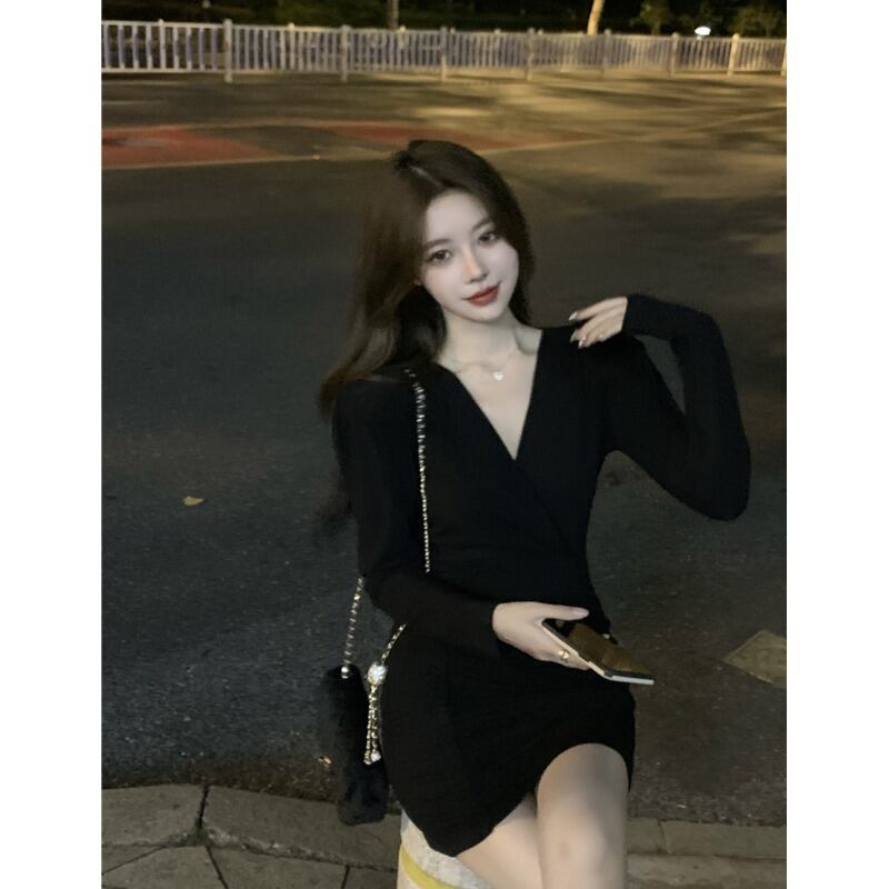 レトロな気質スリム V ネック黒ドレス女性の春と秋 2023 新しいウエスト痩身長袖ショートスカートヒップ ロング ブラック スプリング 春物 オータム 秋物 Vネック 0921935140534280