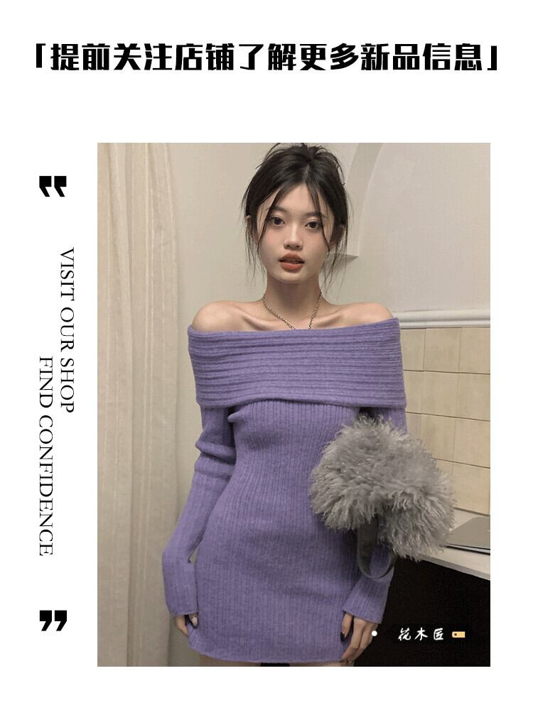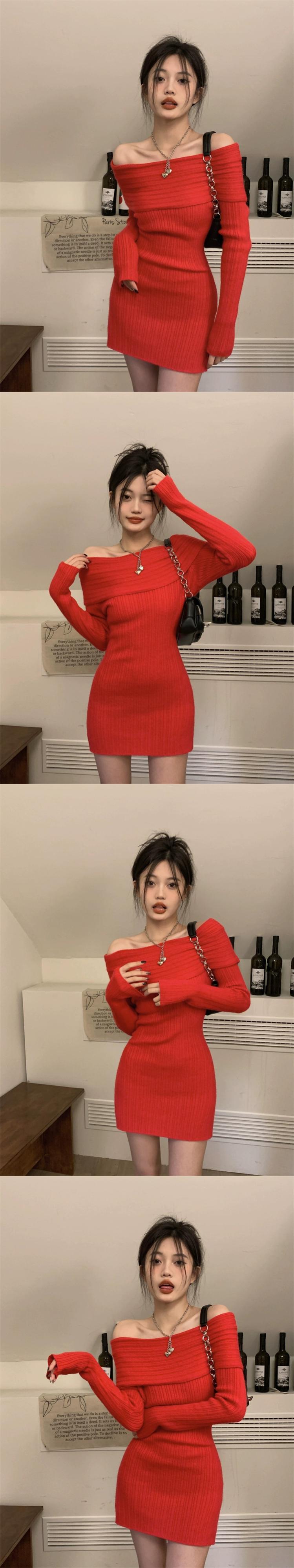 香港スタイルのレトロな一言襟ニットドレスの女性の春と秋の 2023 新しいデザインセンス 2 着用ウエストボトリングスカート スプリング 春物 オータム 秋物 0921992039965597