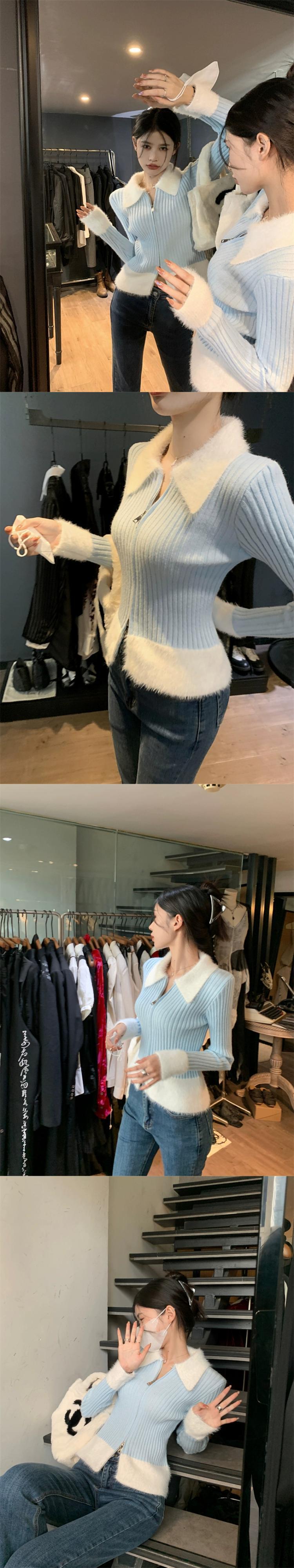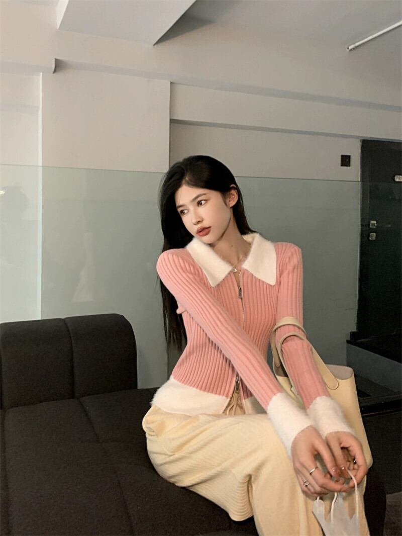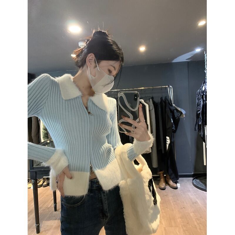 毛皮のようなスプライシングダブルヘッドジッパーセータージャケット女性の春と秋の 2023 新しいショートセクションスリムスリムカーディガントップ潮 スプリング 春物 オータム 秋物 0921912220224873