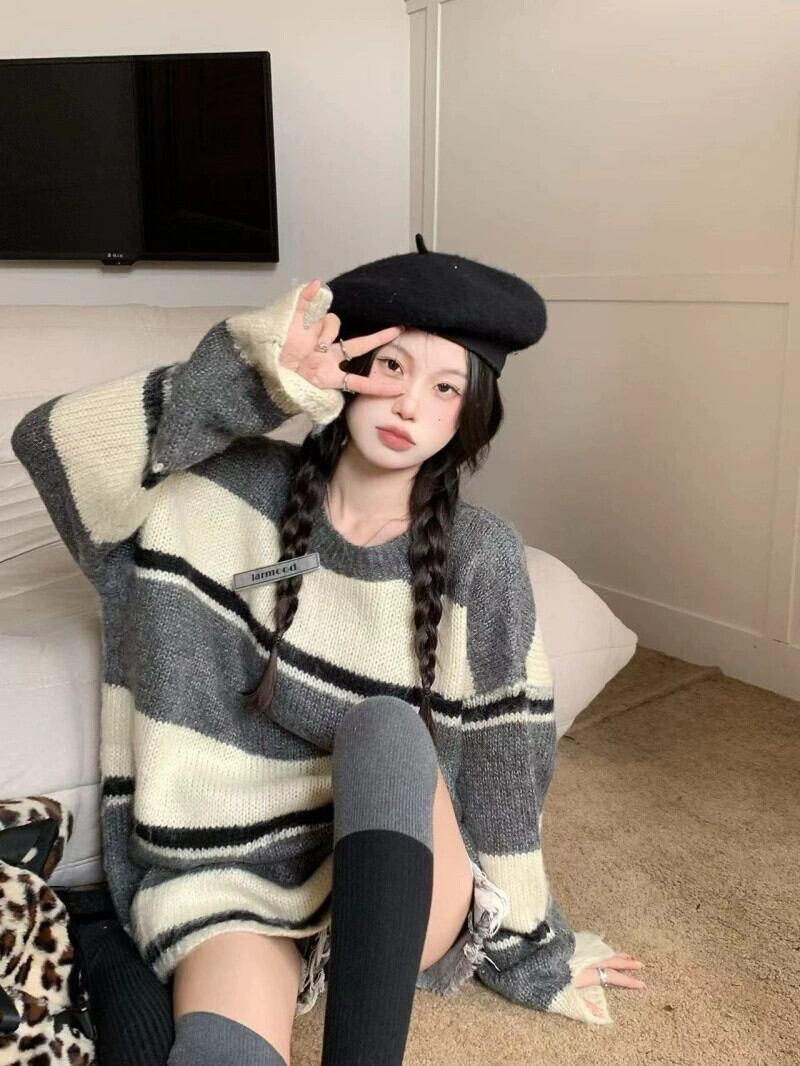 スタイルレトロコントラストカラーストライプルーズセーター女性の春 2023 新しいソフトワックスオールマッチスリムプルオーバーセーター スプリング 春物 0921986070777663