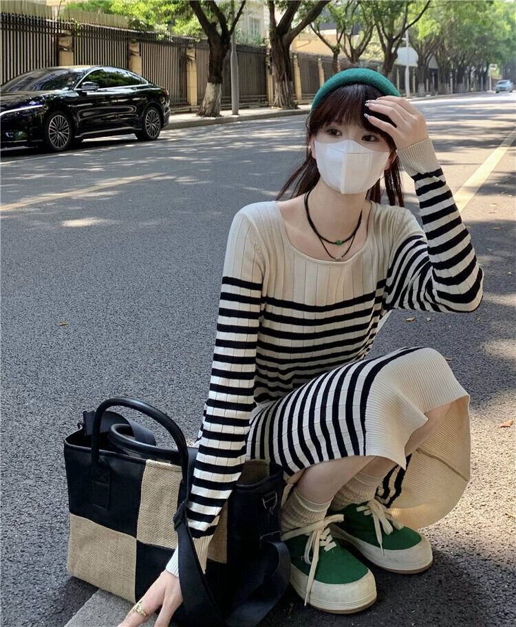 ストライプカラーコントラストのバージョンの怠惰な風長袖ニットドレス女性の春のインナースカートカジュアル気質ロングスカート スプリング 春物 0921939904867388