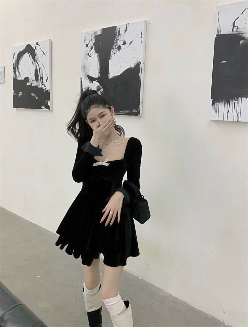 フレンチスタイルの黒ベルベット長袖ドレス女性の春と秋2023新しい気質セクシーなウエスト痩身ショートスカートイン ロング ブラック スプリング 春物 オータム 秋物 0921956806816534