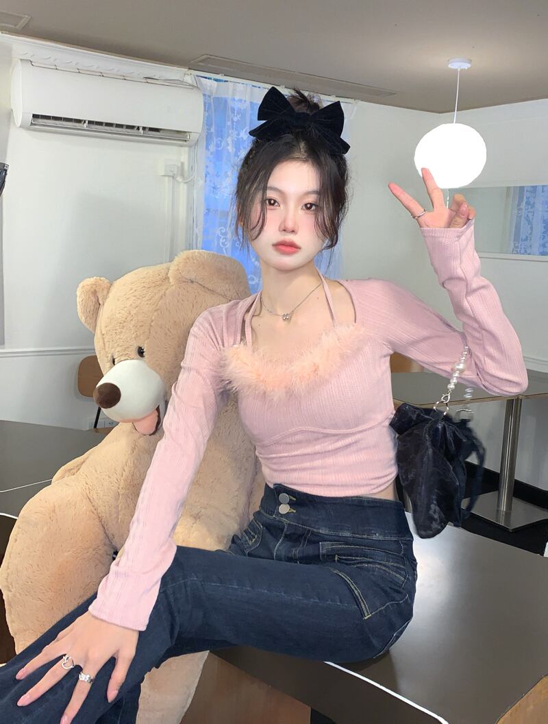 ニッチなデザインセンスの純粋な欲望を繋ぎ合わせたピンクの長袖Tシャツの女性の2023年春の新しい気質のスリムショートトップ ロング スプリング 春物 ピュア 0921955372511888