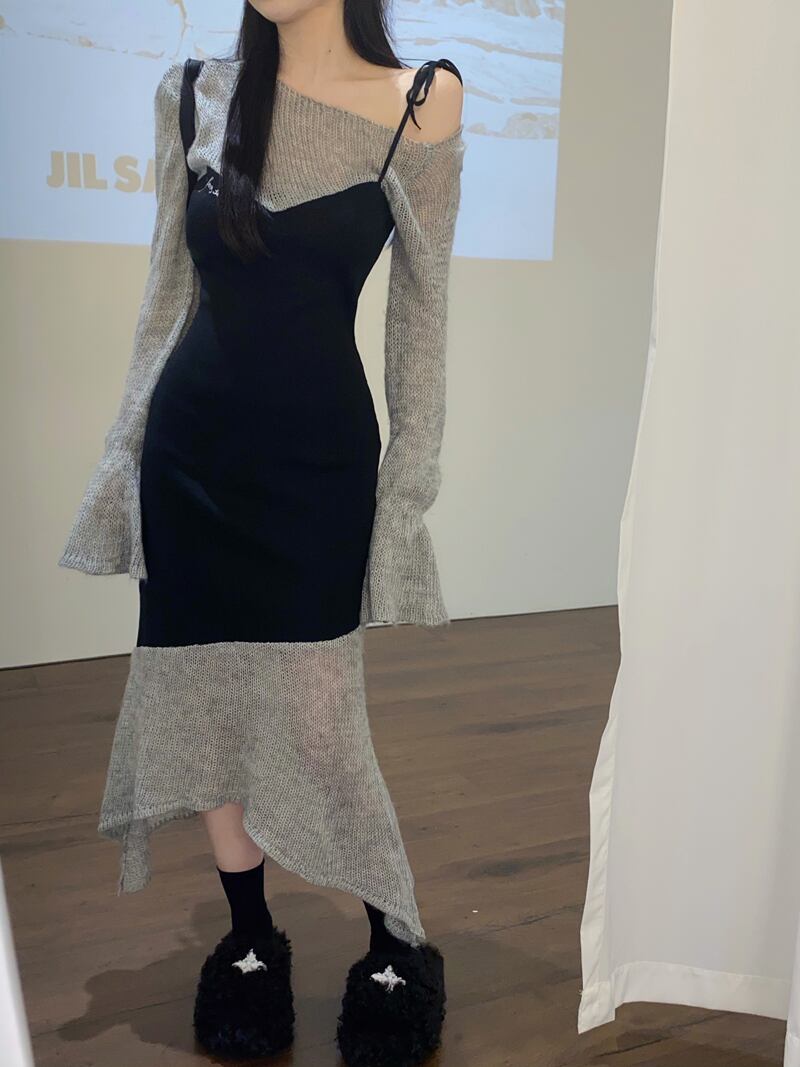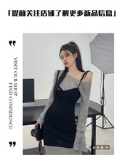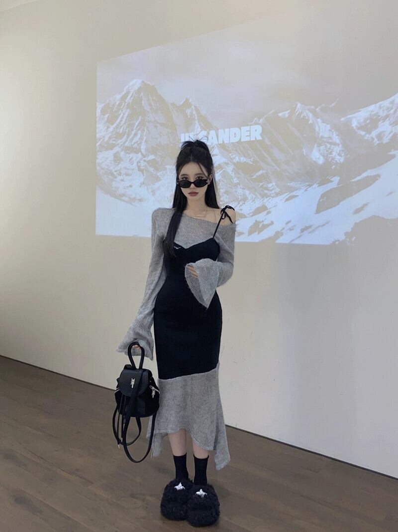 フェイクツーピースステッチ不規則な長袖ドレスの女性の春と秋の2023新しいオールマッチスリムでスリムなミドル丈スカート ロング スプリング 春物 オータム 秋物 0921942122500160
