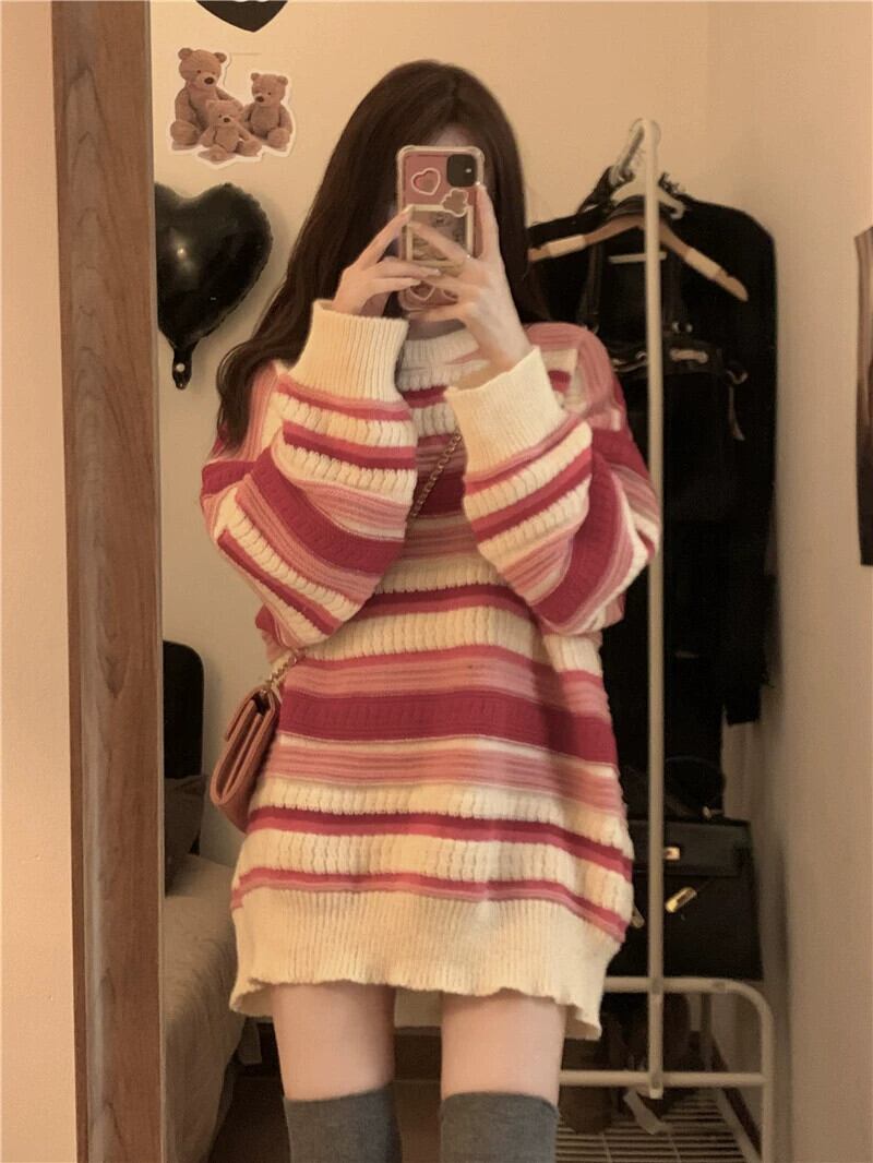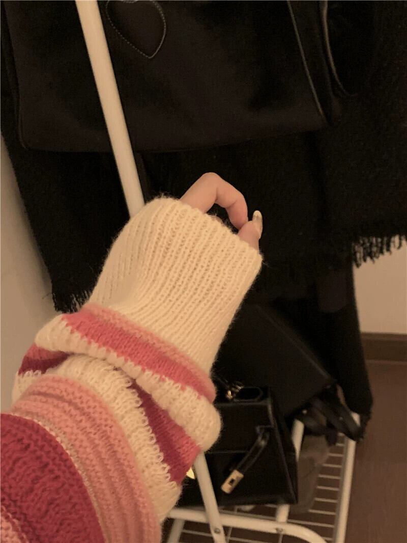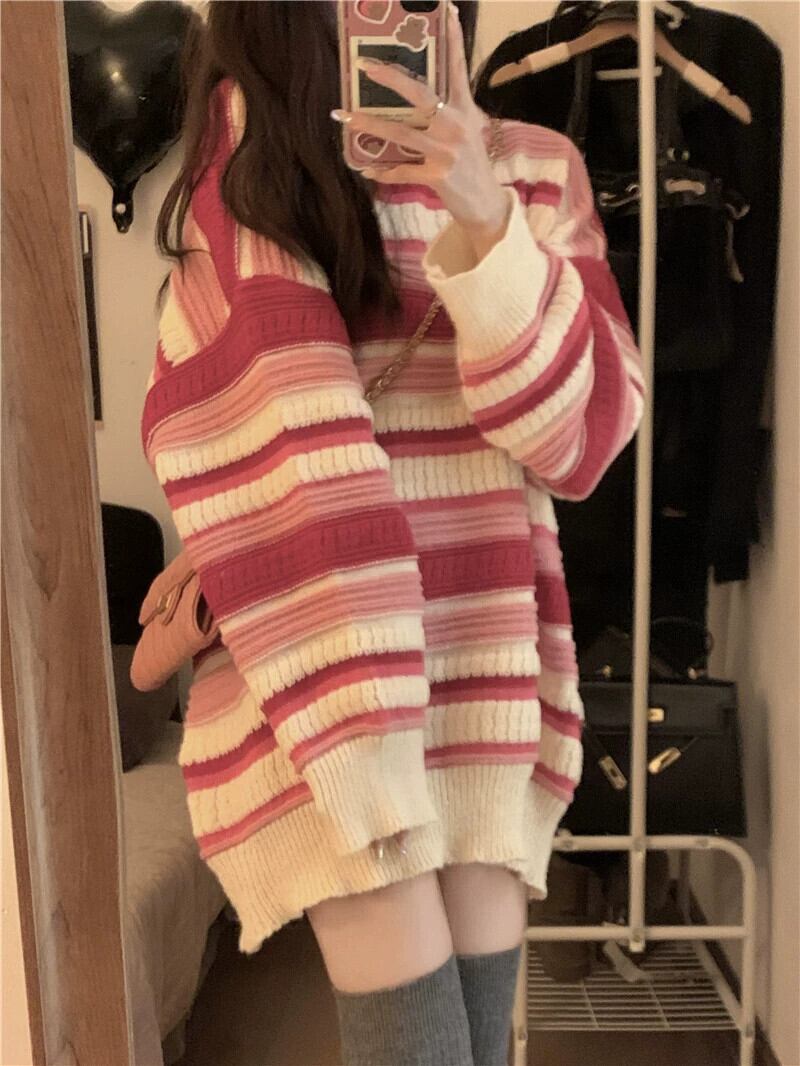 バージョン緩い怠惰な風ラウンドネックセーター女性の春 2023 新時代削減オールマッチコントラストカラーストライプニットトップ スプリング 春物 Oネック 092191421500767