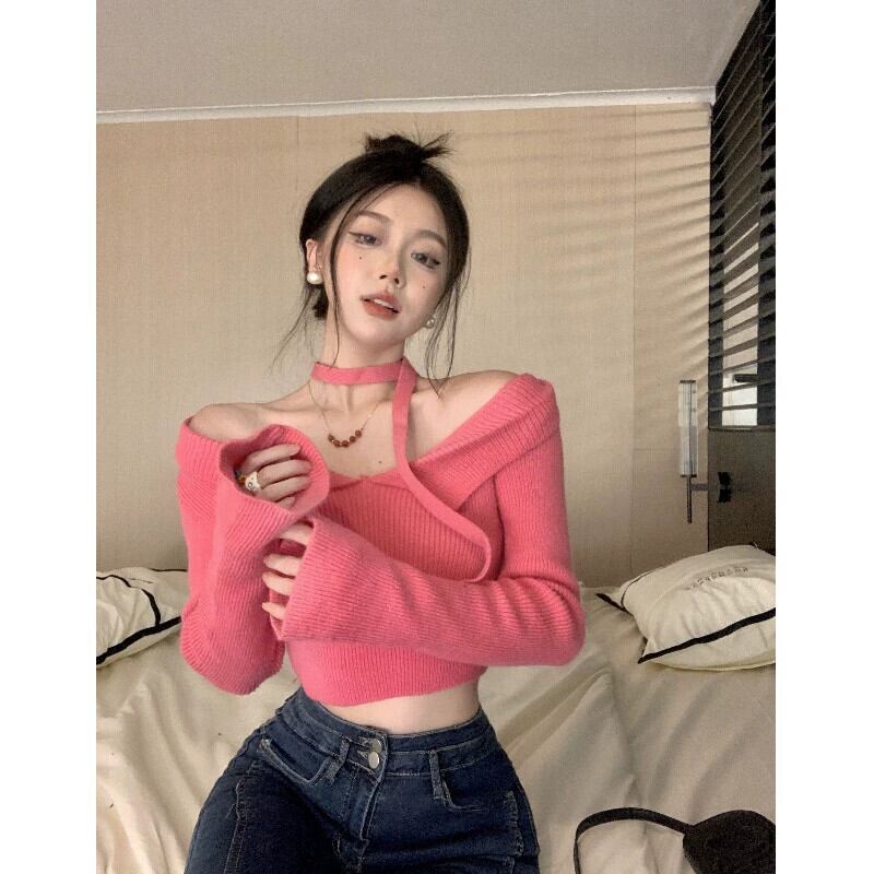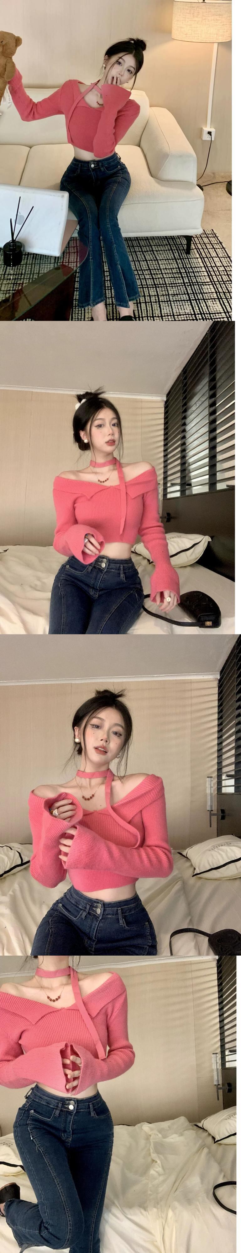ホットワンショルダーショート長袖ニットセーター女性の2023春の新しいデザインセンスの痩身と薄いボトムトップ ロング スプリング 春物 0921999647105592