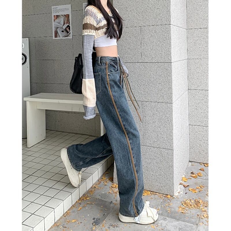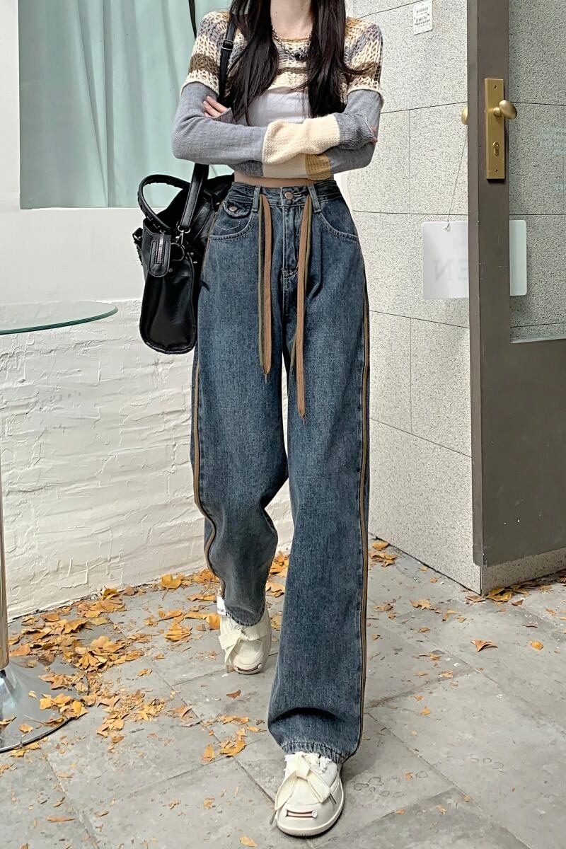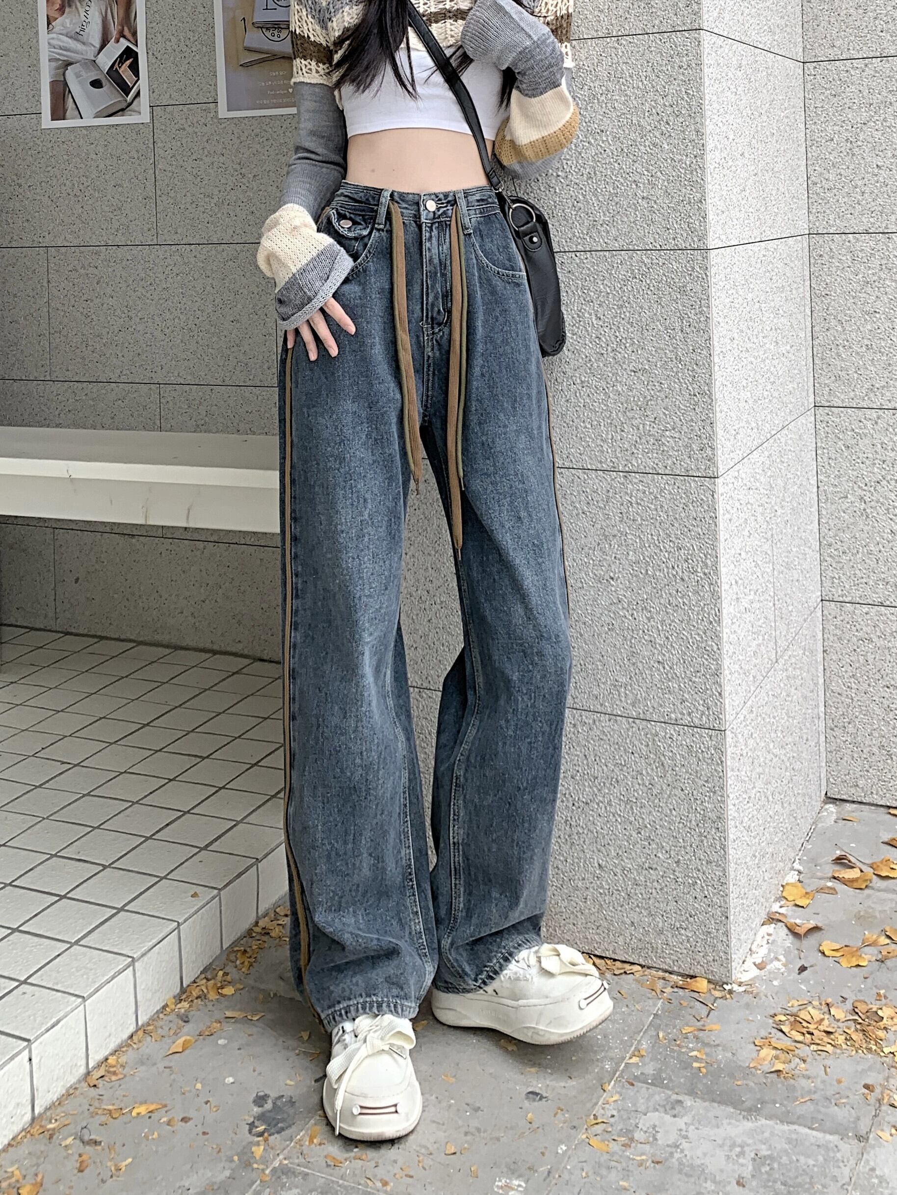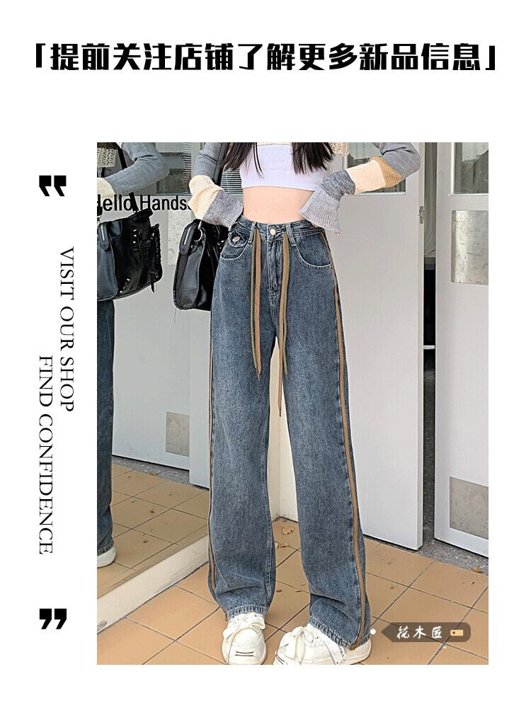 バージョンのレトロなデザインセンス巾着ハイウエストジーンズ女性の春と秋の 2023 新作ルーズで薄いストレートワイドレッグパンツ ハイウェスト スプリング 春物 オータム 秋物 ワイドパンツ 0921911187058921