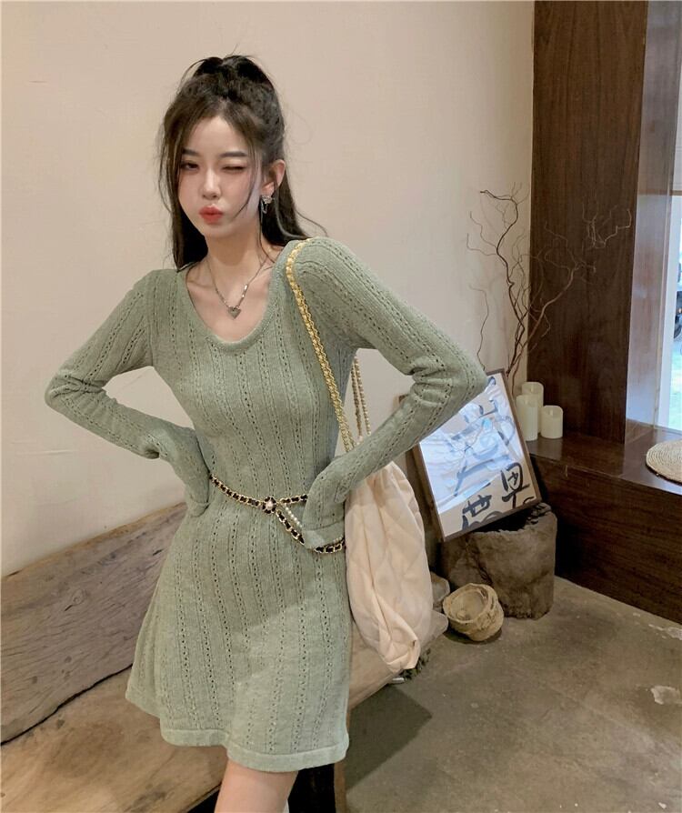 純粋な欲望のバージョンのスタイル V ネック長袖ドレスの女性の 2023 夏の新しいソリッドカラーオールマッチウエスト痩身 A ラインスカート ロング サマー 夏物 Vネック Aライン ピュア 0921955958308372