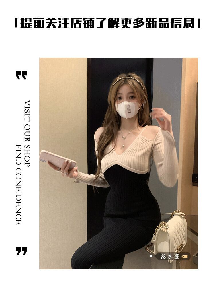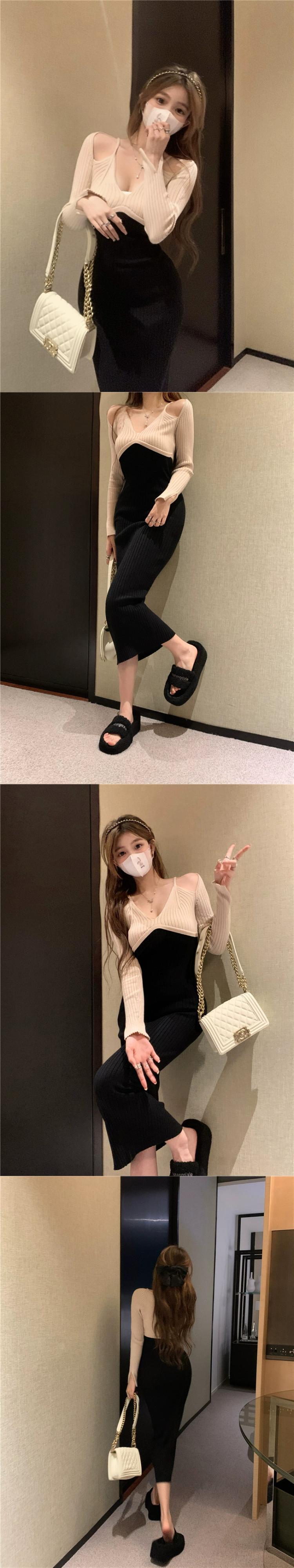 純粋な欲望スタイルぶら下げネックストラップレス長袖ニットドレス女性の春と秋のセクシーなスリムボトバッグヒップロングスカート スプリング 春物 オータム 秋物 092194807416604