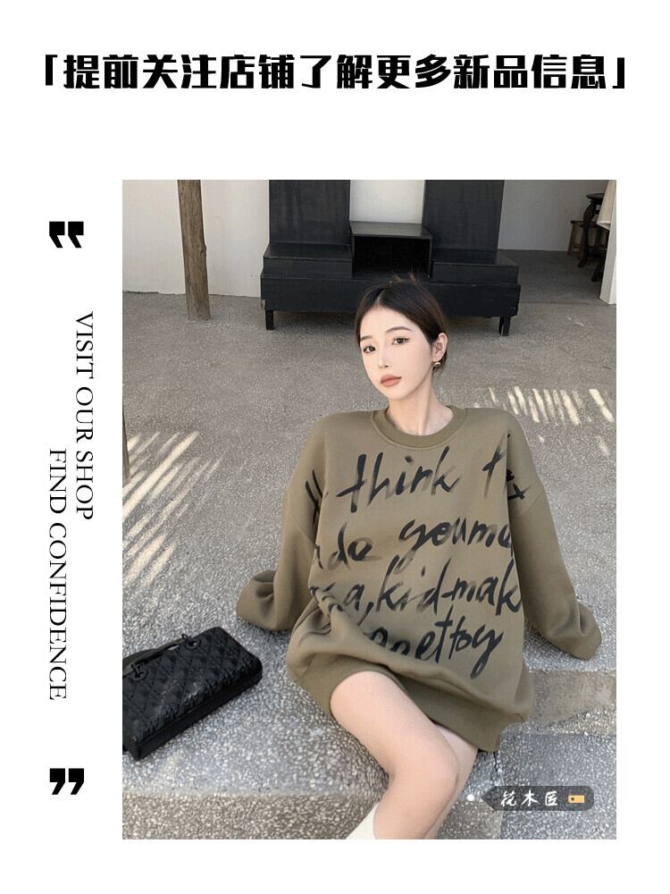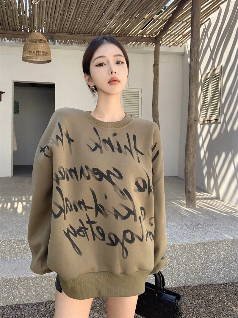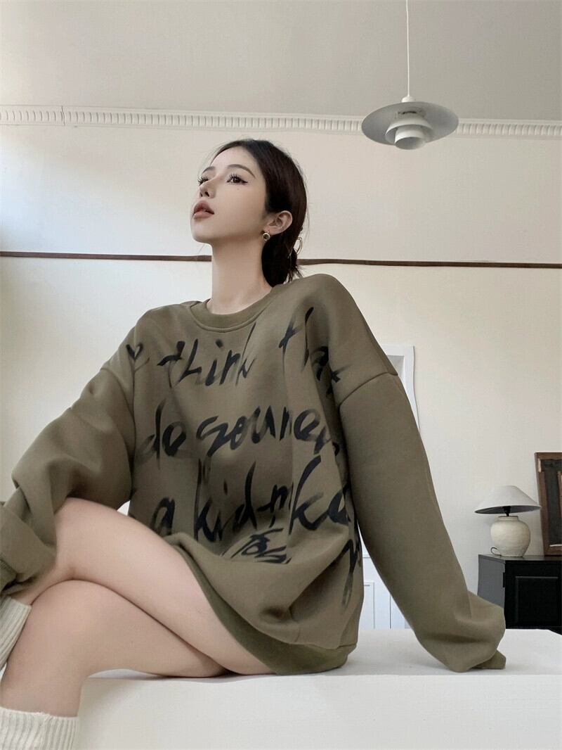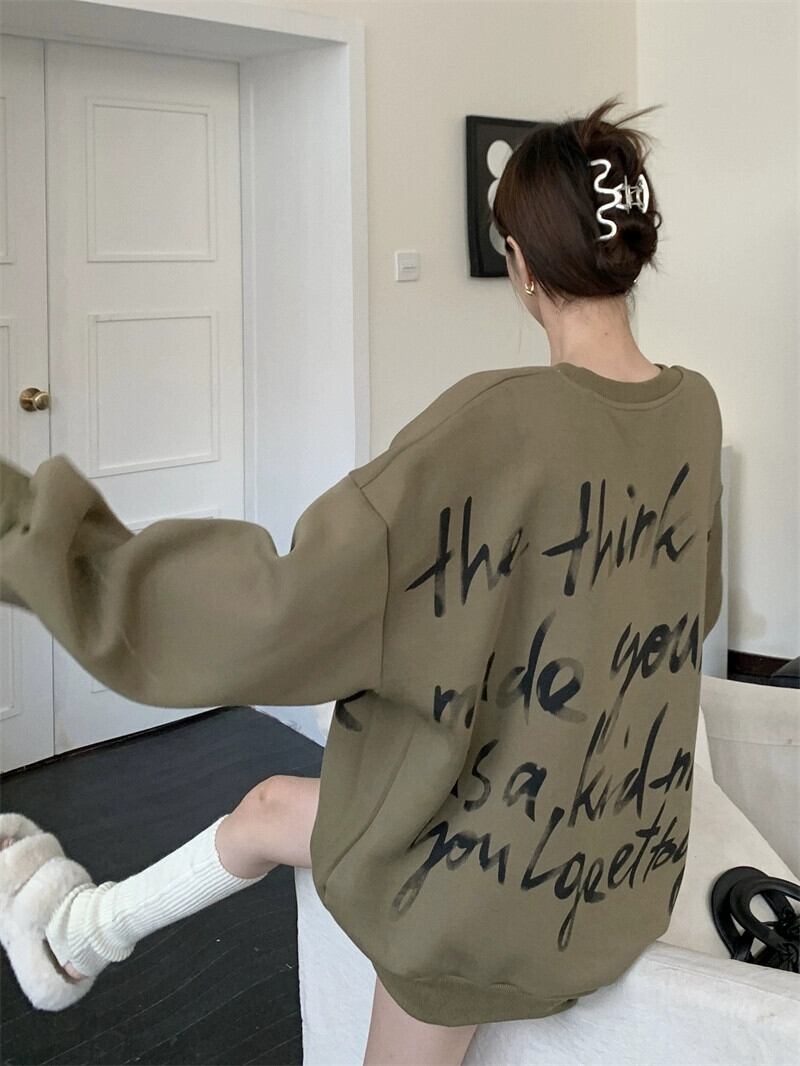 レトロなデザインのラウンドネック前後レタープリントセーターレディース 2023 春の新作オールマッチルーズ長袖トップ ロング スプリング 春物 Oネック 0921965086518596