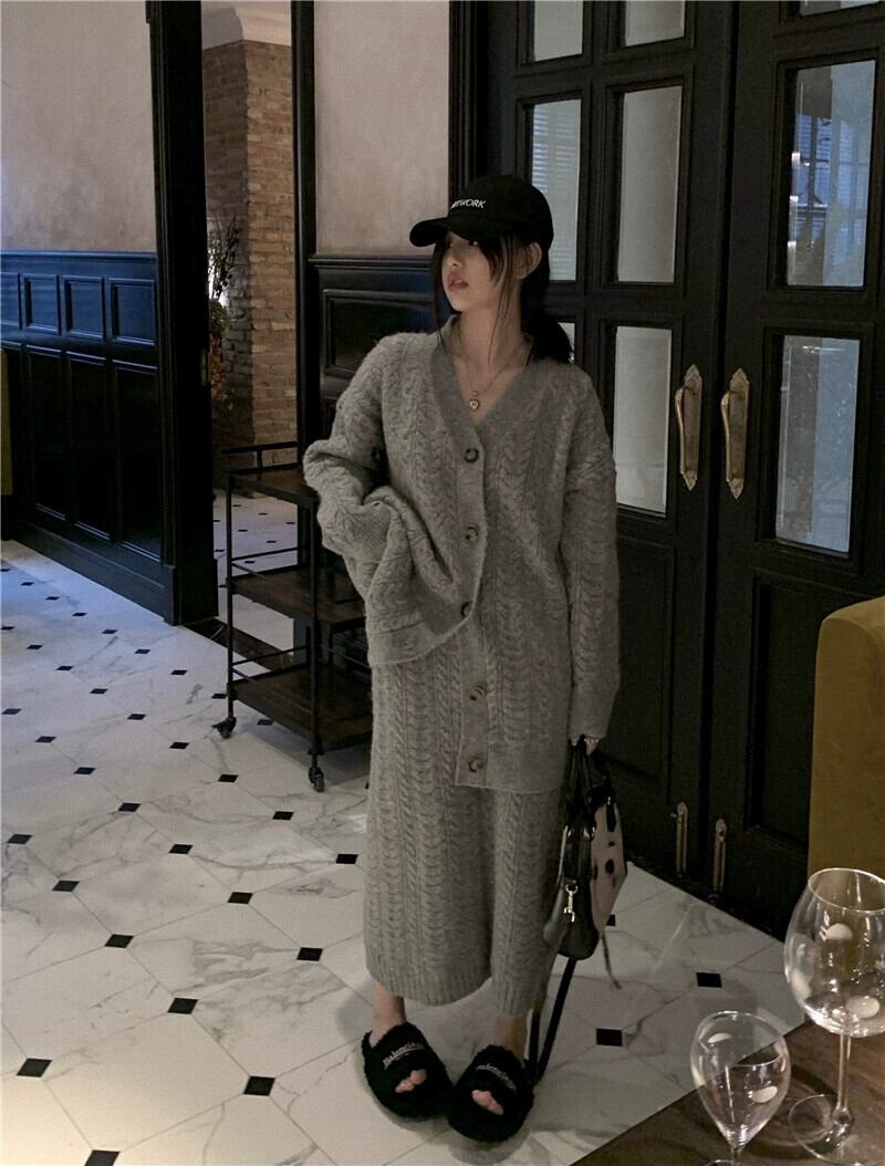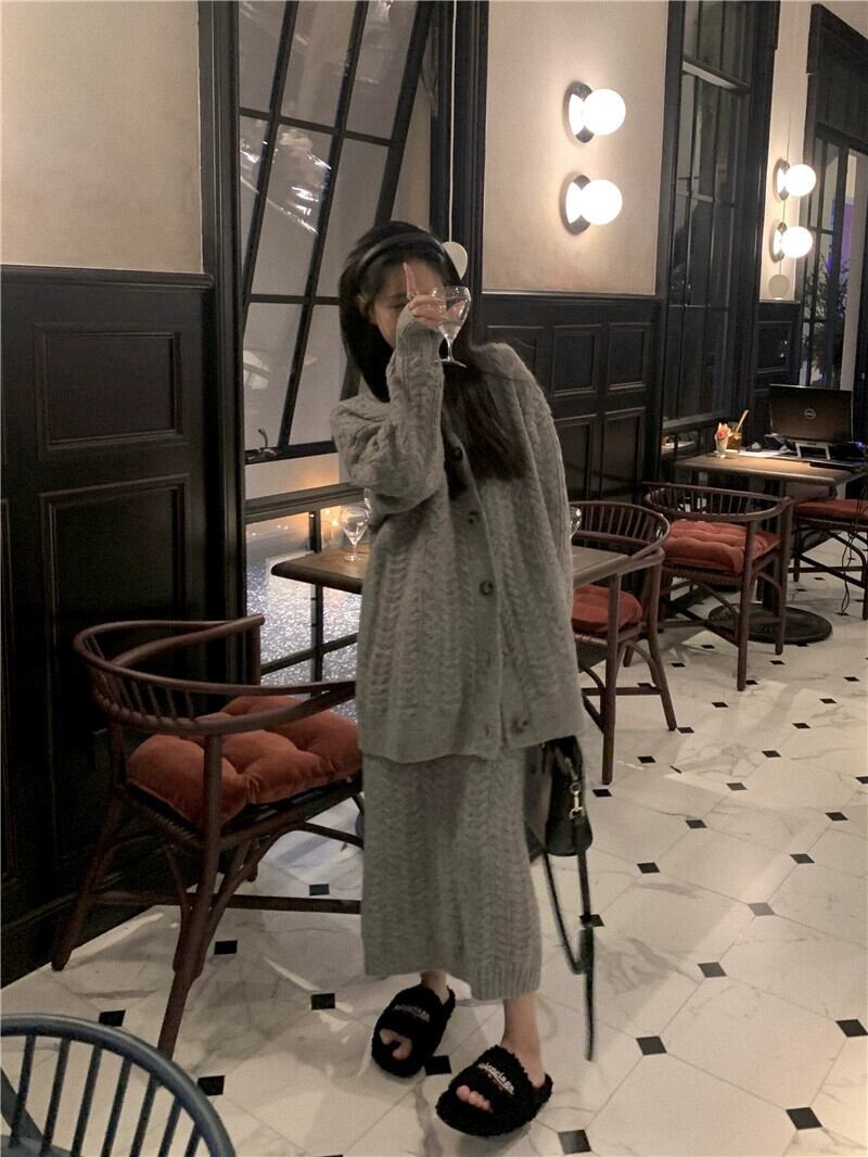 怠惰なソフトワックススーツの女性の春 2023 新しい斜めバックル模造アルパカセーターコートニットスカート 2 点セット スプリング 春物 0921942175183476