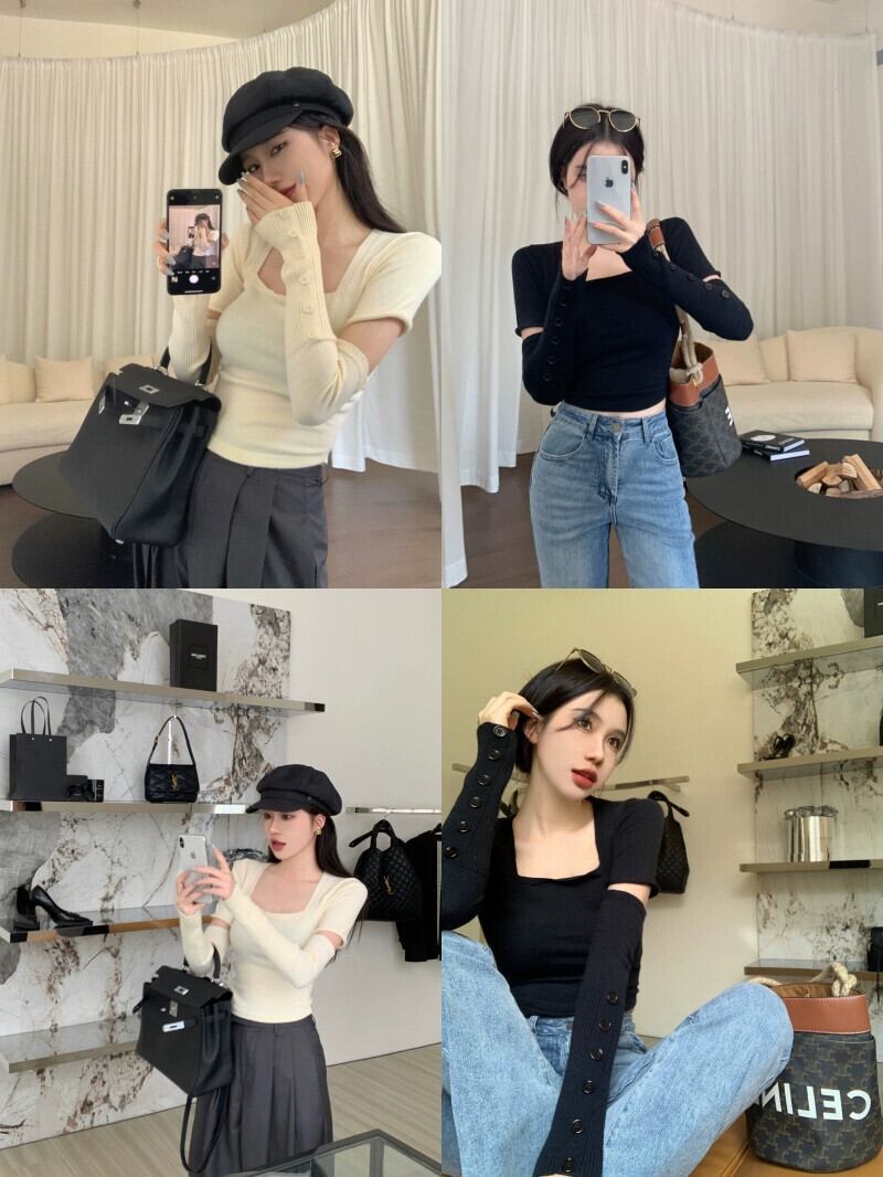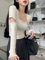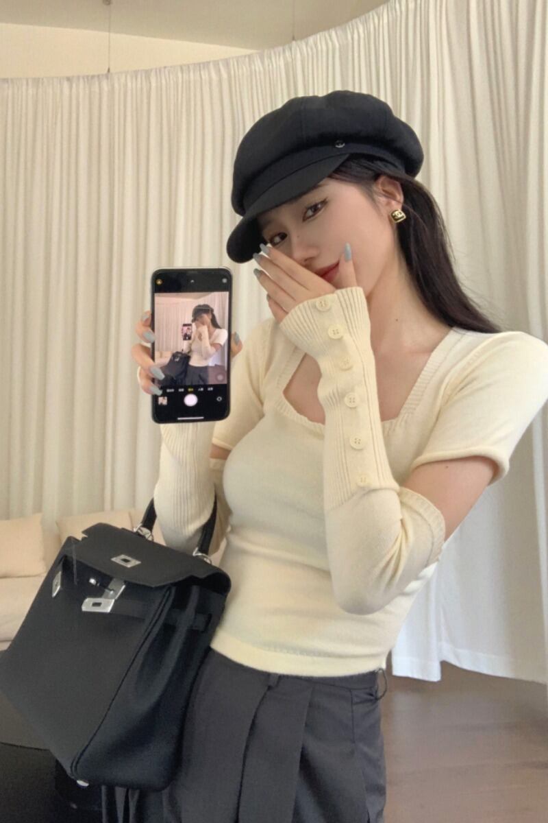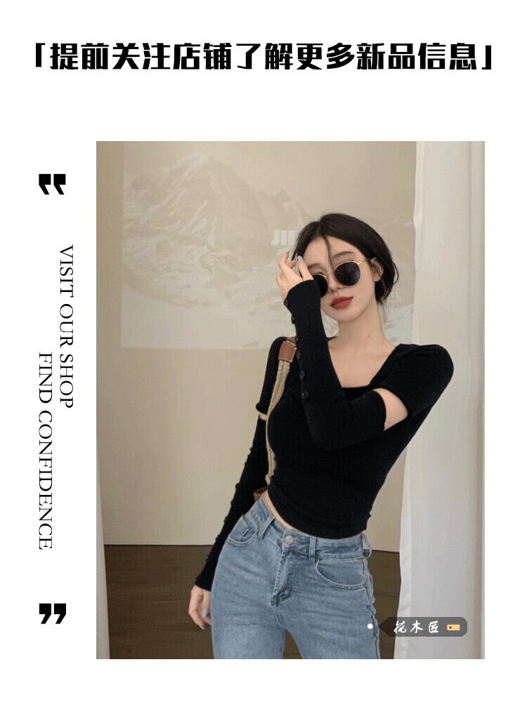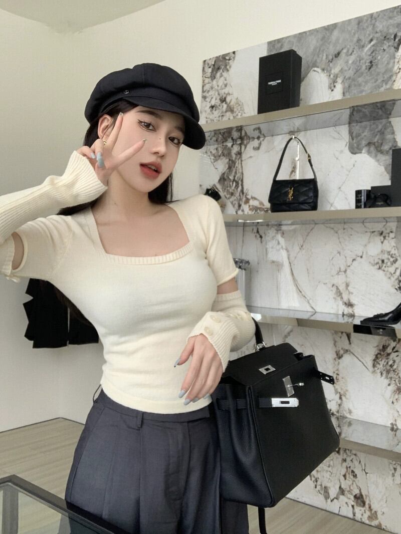 センスシックなスクエアカラー長袖ニットセーター女性の2023春の新しい気質スリムショートトップ潮 ロング スプリング 春物 スクウェア 0921979651943555