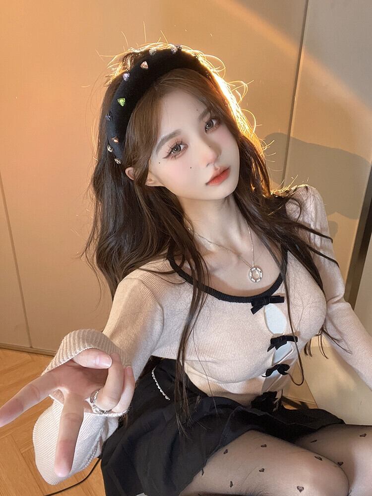 純粋な欲望スタイル甘い弓長袖ニットセーター女性の 2023 年春の新デザイン中空長袖ボトリングシャツ ロング リボン 大人ガーリー スウィート キュート カジュアル スプリング 春物 0921922161473724
