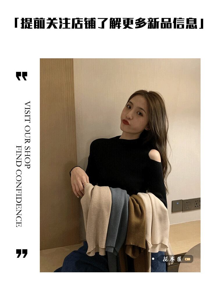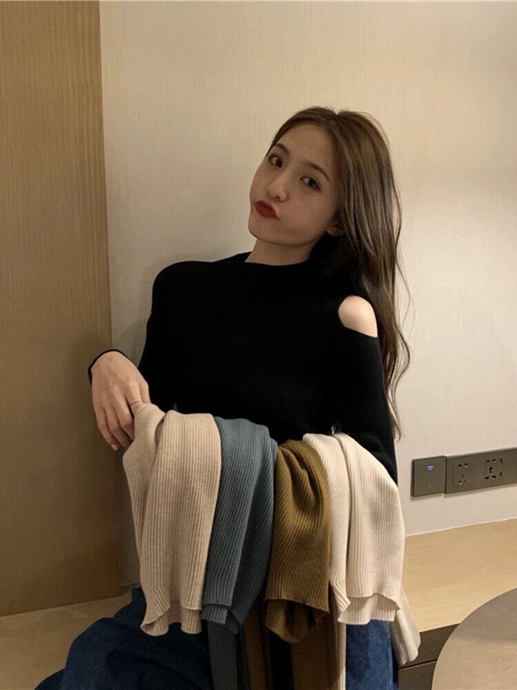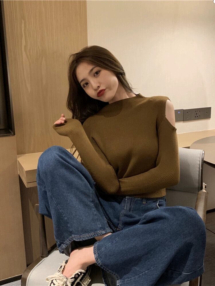 オフショルダー慎重な機械中空長袖ハーフハイカラーニットセーターレディース 2023 年春の新しいスリムフィットボトリングシャツトップ ロング スプリング 春物 0921953829905605