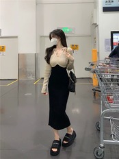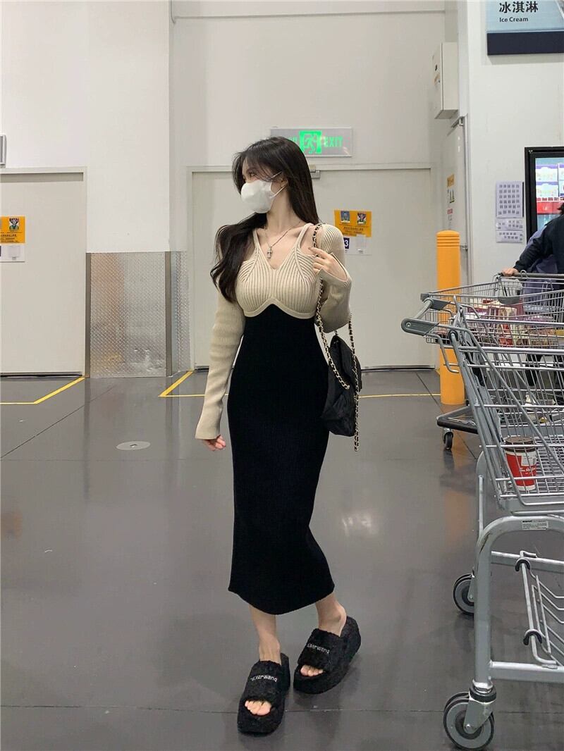 フレンチスタイルの優しいスタイルのホルターネックニット長袖ドレス女性の春と秋の2023新しいスプライシング薄底ミッドレングススカート ロング スプリング 春物 オータム 秋物 09219257183050