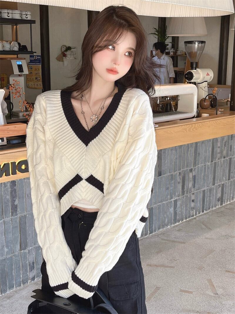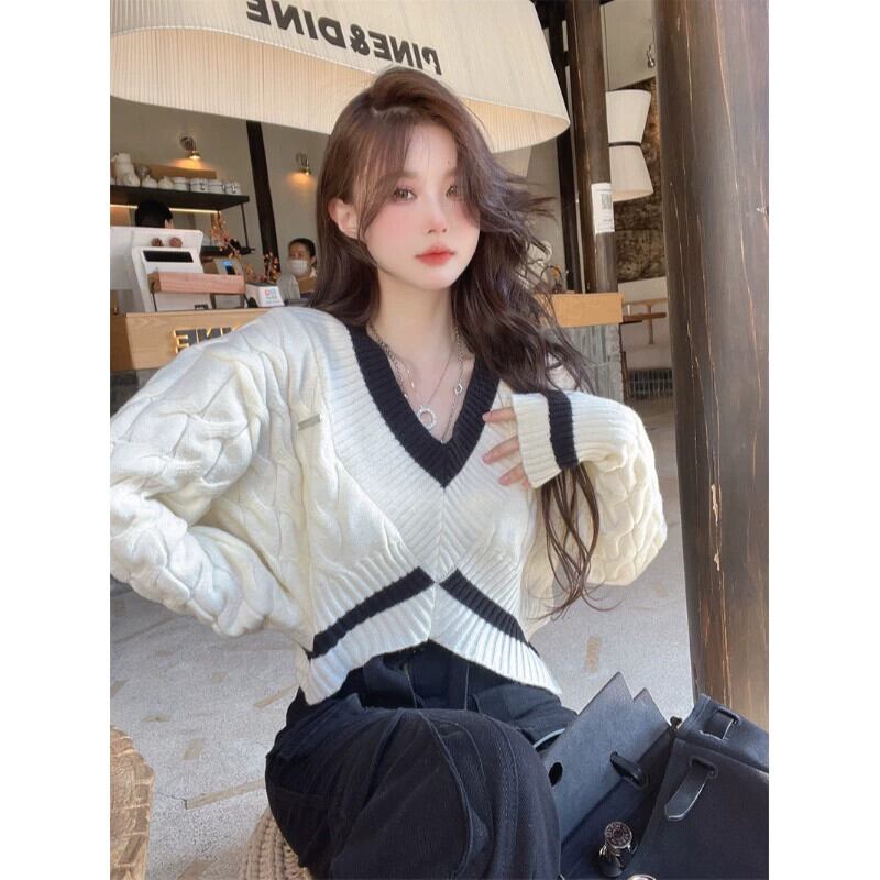 カレッジスタイルのカラーVネックツイストセーターレディース2023年初春新作ルーズショート長袖ニットトップのバージョン ロング スプリング 春物 0921934152377981