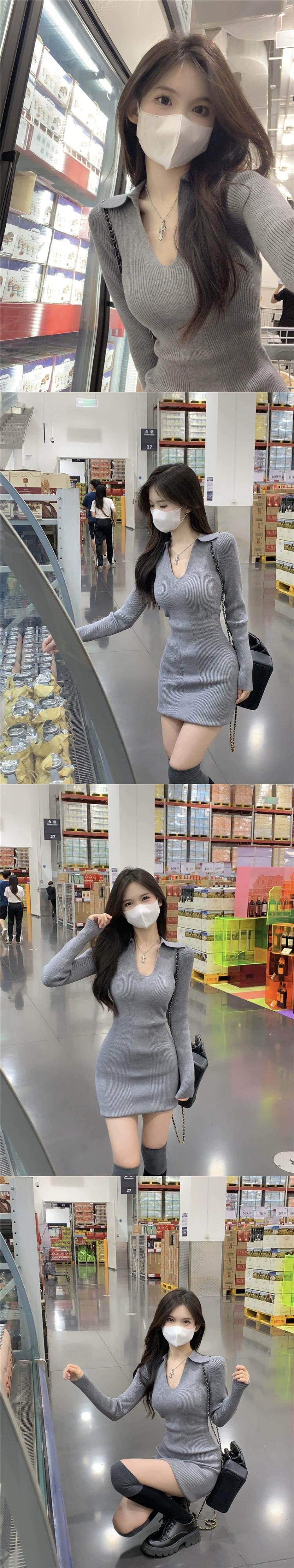 セクシーな純粋な欲望のポロカラー長袖ニットドレス春と秋のインナーショートスカートスリムフィットウエストバッグヒップスカート ロング スプリング 春物 オータム 秋物 ピュア 0921977779099840