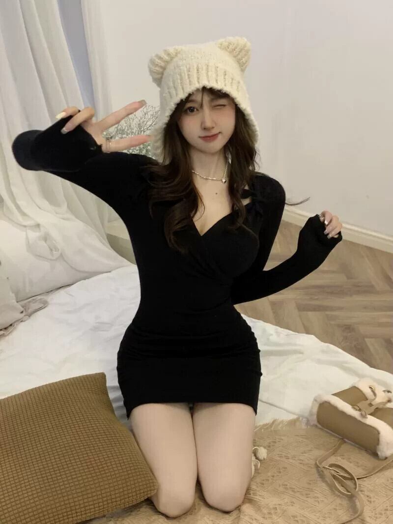 純粋な欲望セクシーな V ネック長袖ニットドレス女性の春と秋 2023 新しい蝶ネクタイウエスト痩身ヒップスカート ロング リボン スプリング 春物 オータム 秋物 Vネック 0921975867928245