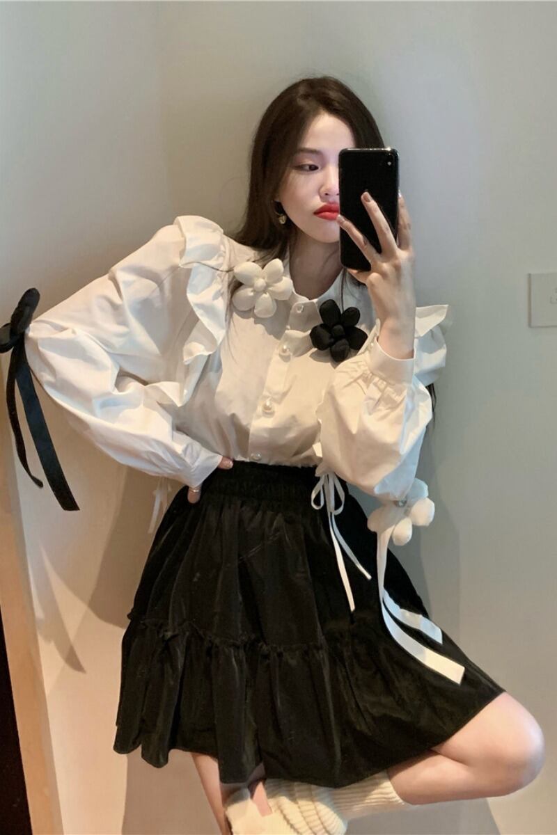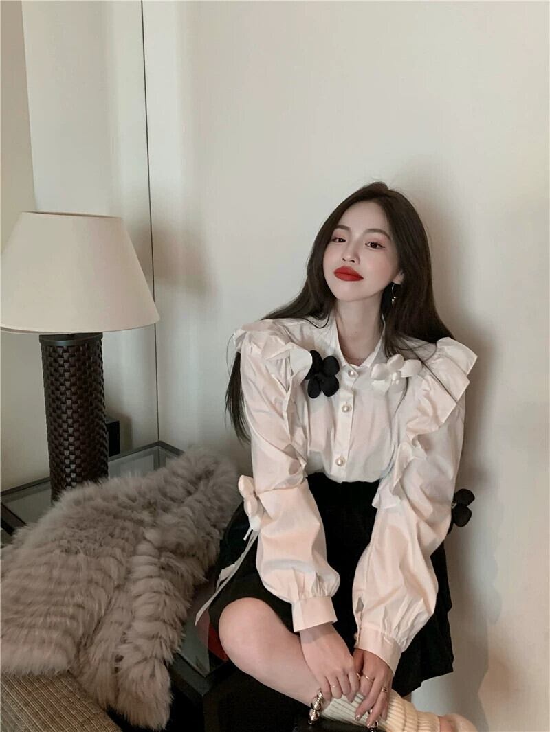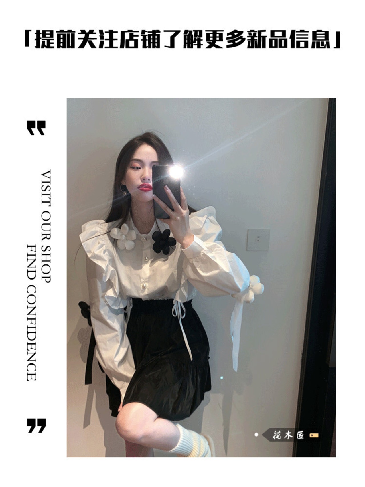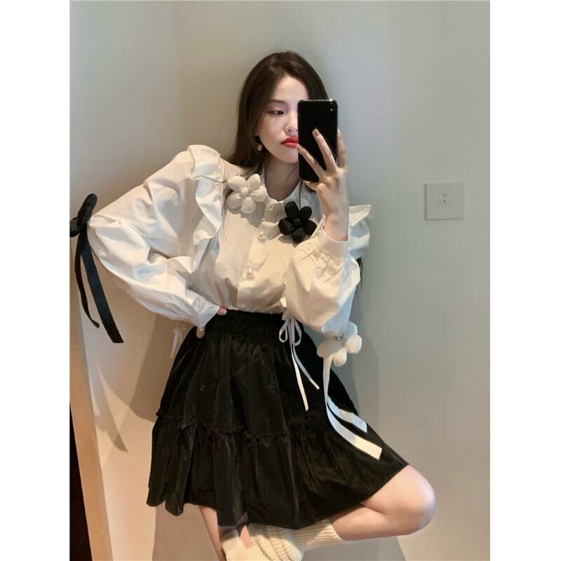 レトロな立体花ニッチフリルシャツ女性の2023春と秋の新しい優しいスタイルの長袖シャツ ロング スプリング 春物 オータム 秋物 フラワーデザイン 0921973991765241