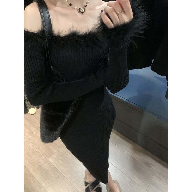 セクシーな一言襟肥厚長袖ドレス女性の冬の 2023 新しいスプライシング毛皮の襟スリムフィットヒップスカート ロング ウィンター 冬物 0921975791463333