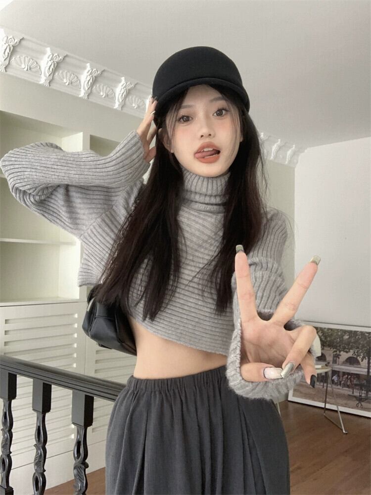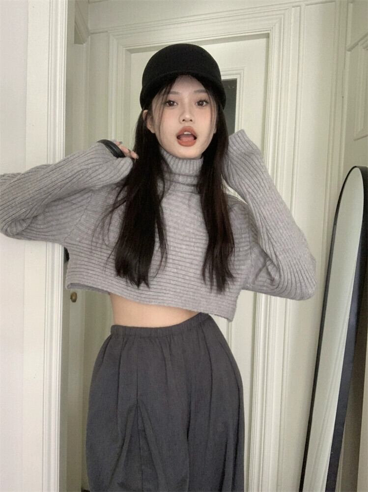 襟無地オールマッチ長袖セーター女性の春と秋 2023 新しいスリムスリムウエストレスショートニットセーター ロング スプリング 春物 オータム 秋物 ソリッドカラー 0921946770822149
