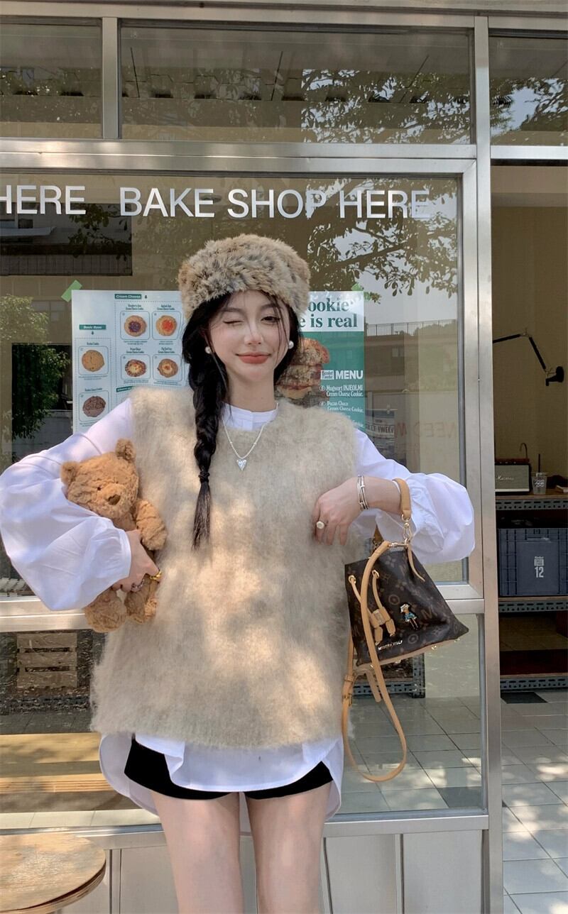 色:白いシャツワンピース,アプリコットベストワンピース