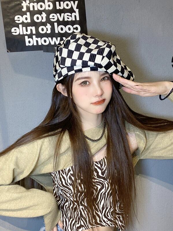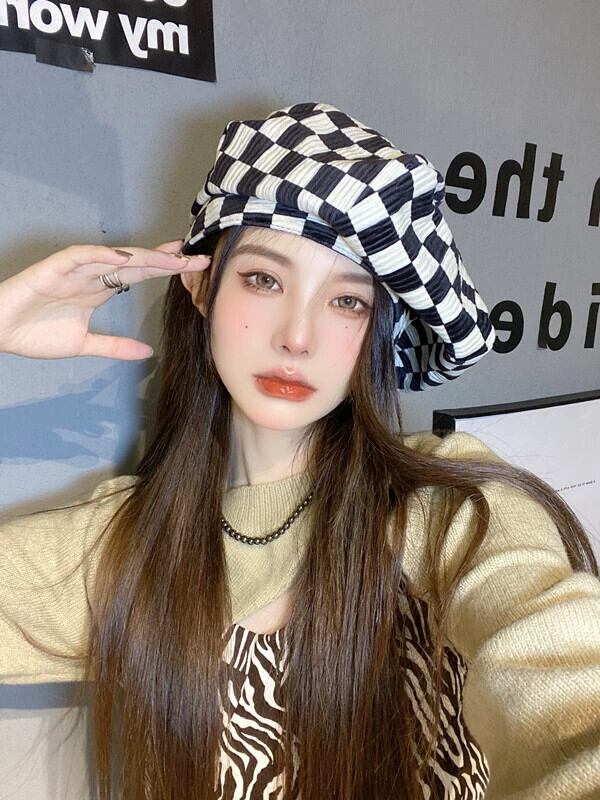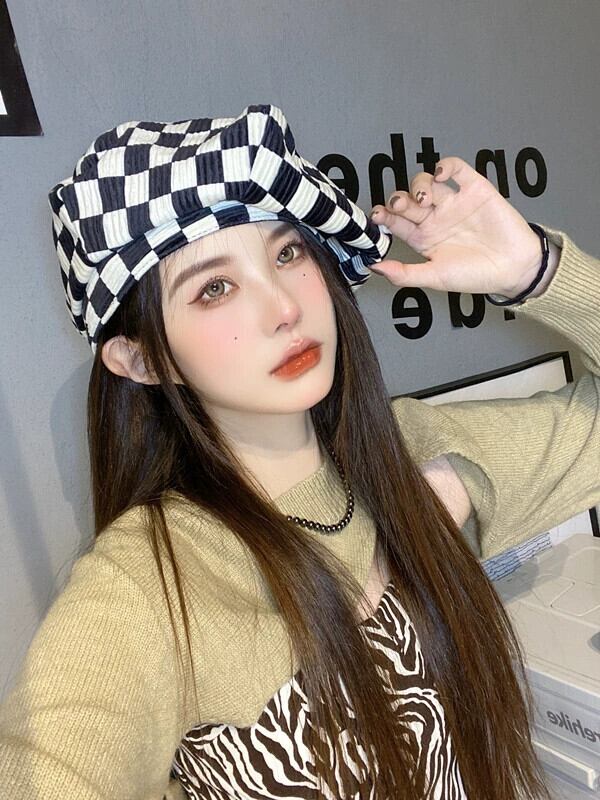 黒と白の市松格子縞のベレー帽女性の春と秋の 2023 新しいファッションインネット赤大きな頭の周りの小さな帽子 ホワイト レッド ブラック スプリング 春物 オータム 秋物 ベレット ヘアアクセサリー 0921928350836639