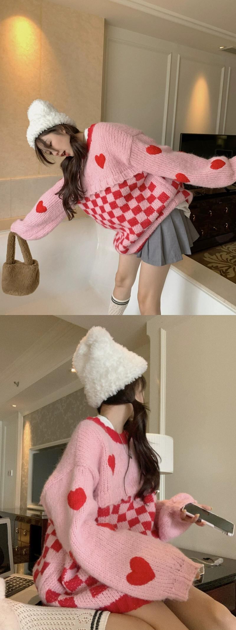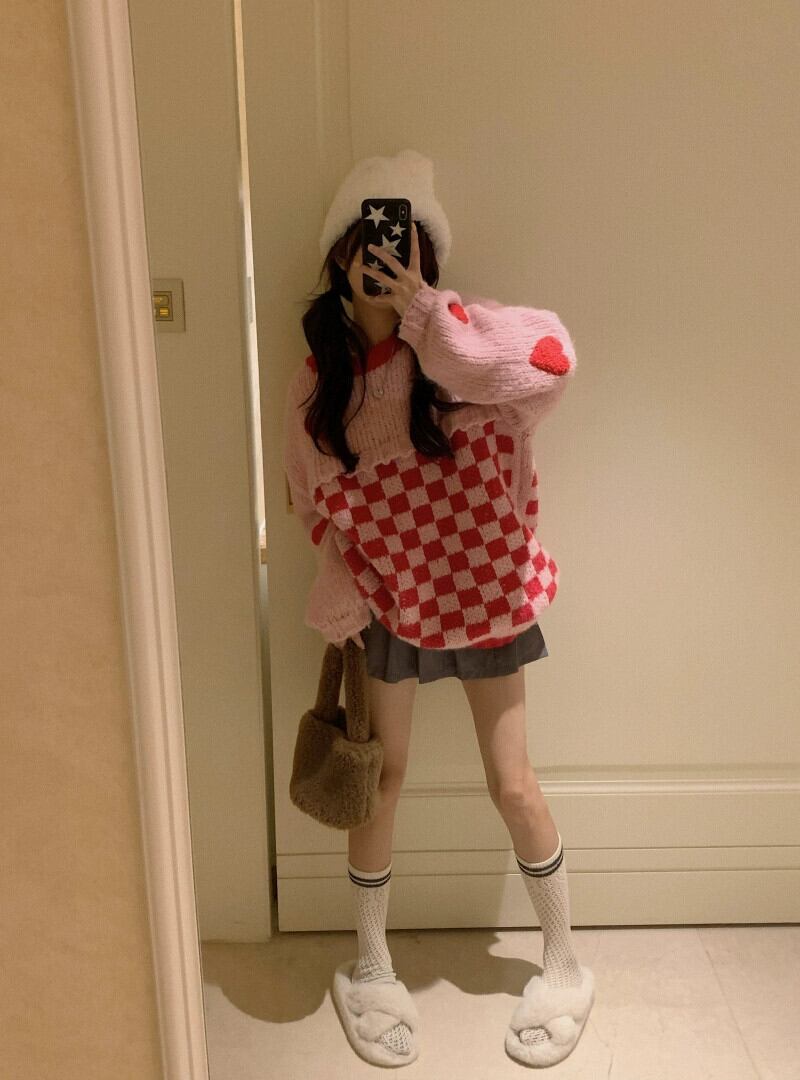 甘いピンク y ラブチェック柄セーターコート女性の春 2023 新しい緩い怠惰なスタイルニットトップ 大人ガーリー スウィート キュート カジュアル スプリング 春物 0921930101647081