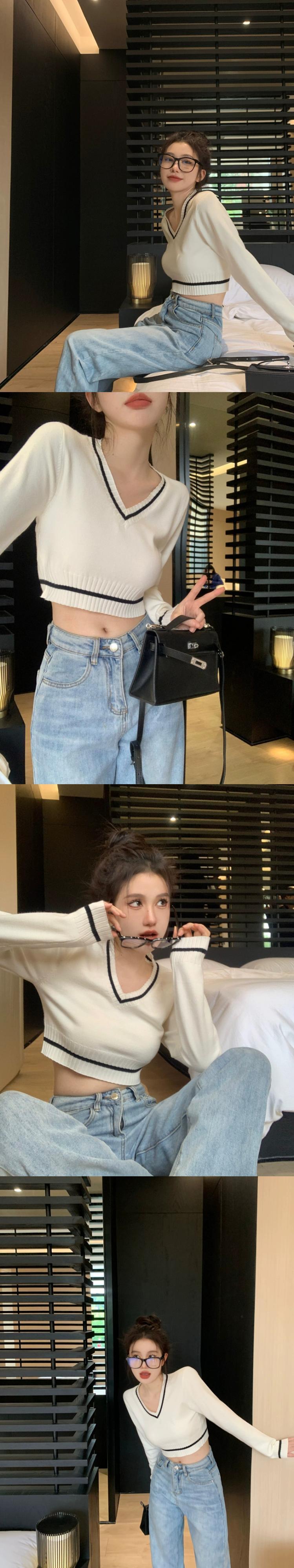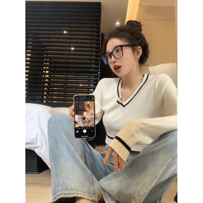 スパイス V ネックカレッジスタイルショートニットセーター女性の春と秋 2023 新しい自己修養長袖ボトムシャツトップ ロング スプリング 春物 オータム 秋物 Vネック 0921971053345908