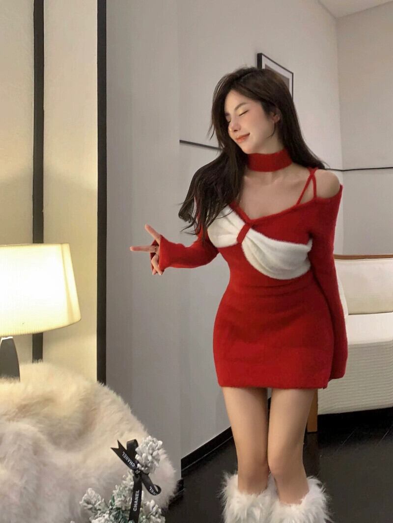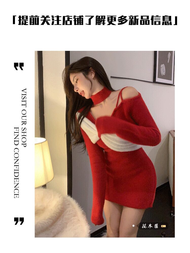 バージョンのカラーマッチング V ネックニット長袖ドレス女性の春と秋 2023 新しいオールマッチスリムスリムスカート ロング スプリング 春物 オータム 秋物 Vネック 092198310585903