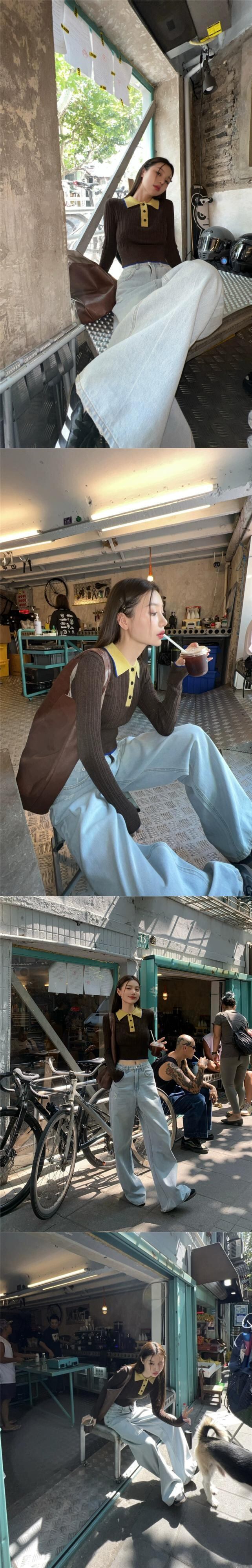 センスポロカラーコントラストカラー長袖ニットセーターレディース2023春新作スリムフィットオールマッチ薄いショートトップ ロング スプリング 春物 0921996606195604