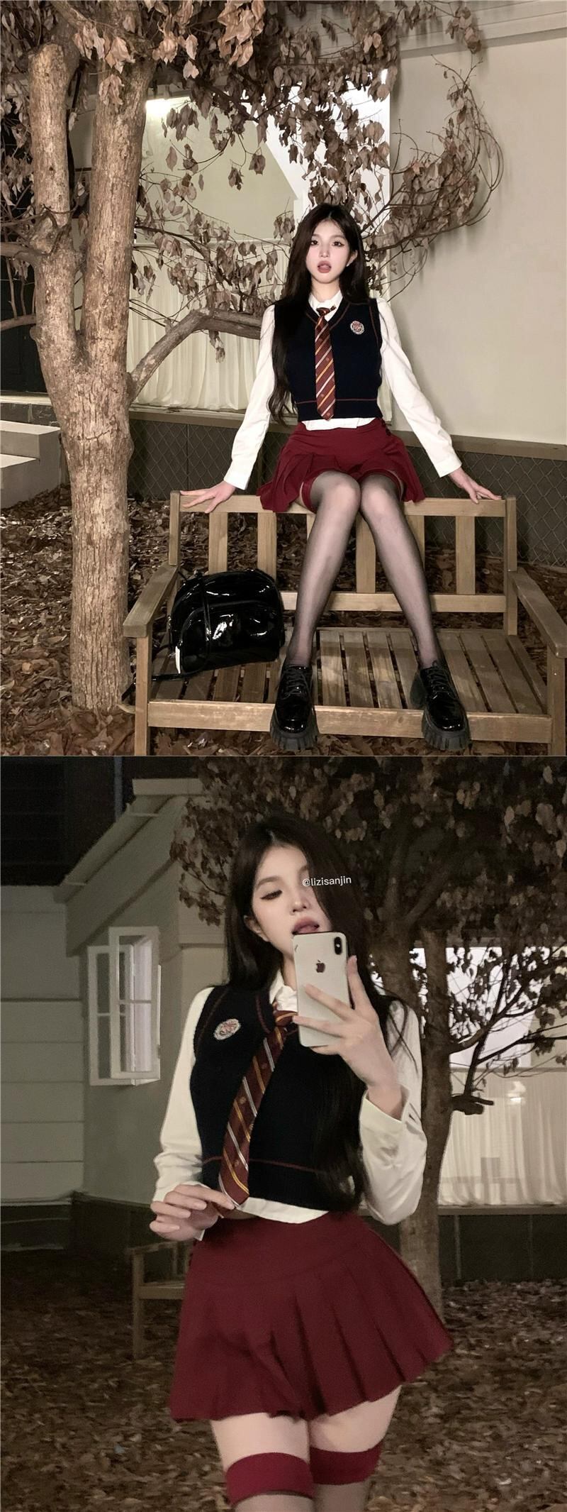 色:ニットベスト,シャツ+ネクタイ,赤プリーツスカート