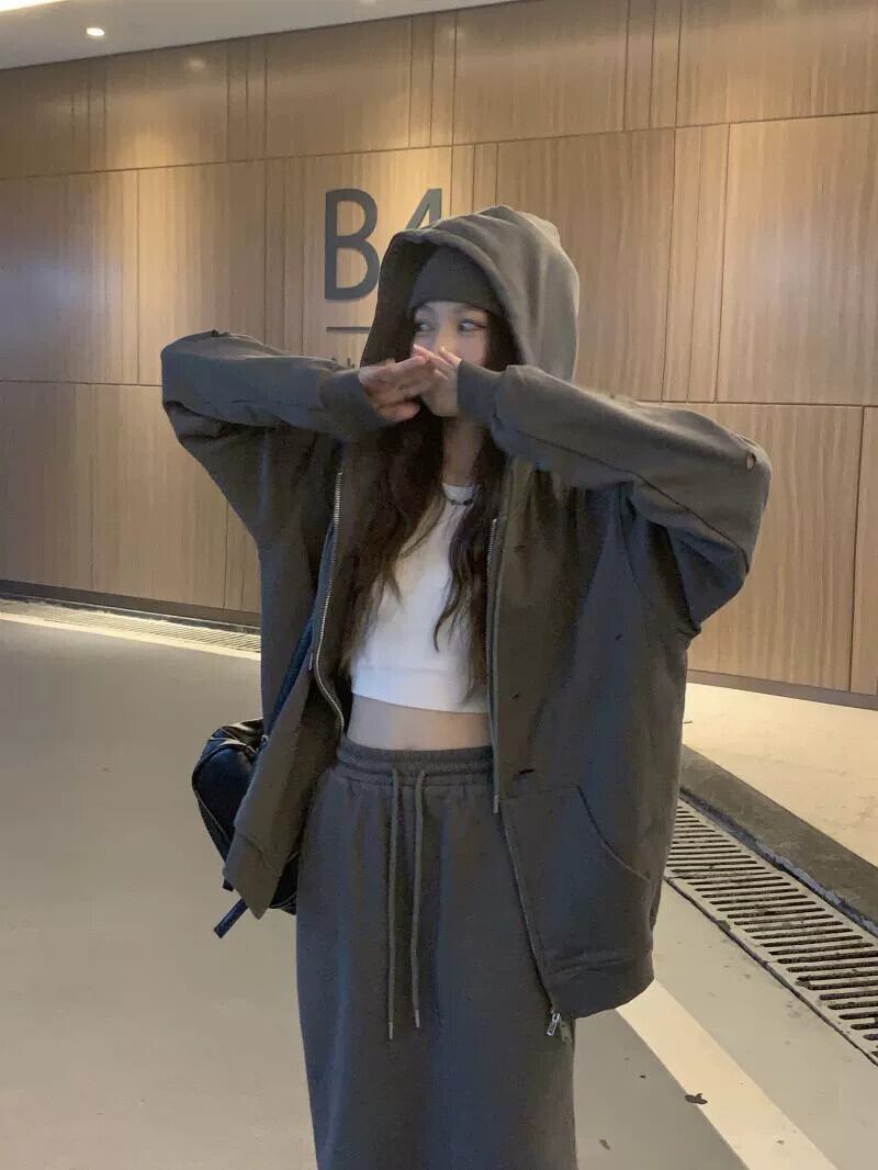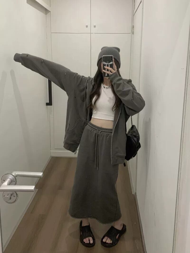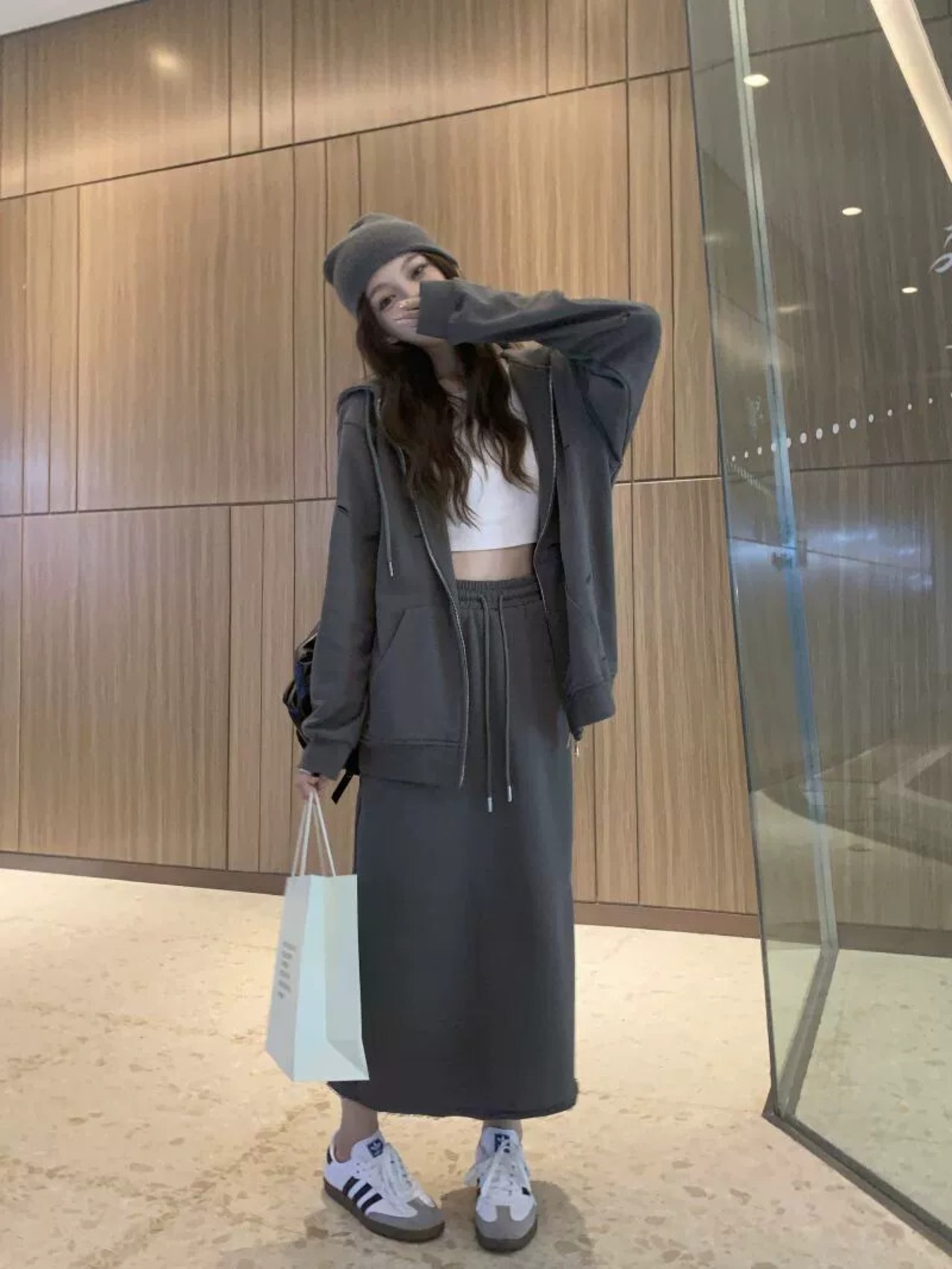 グレーカジュアルスポーツウィンドスーツスカート女性の春 2023 新しい穴フード付きセーター巾着スカート 2 点セット スプリング 春物 092199907767261