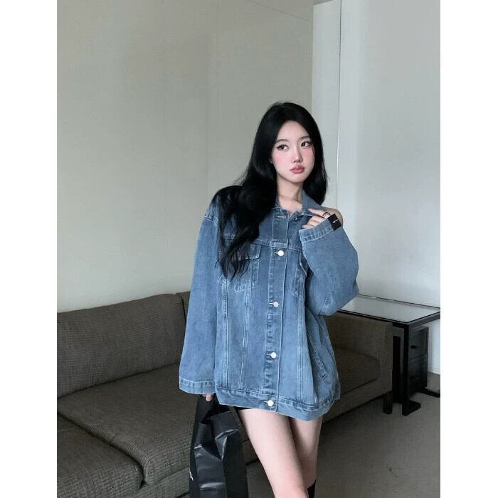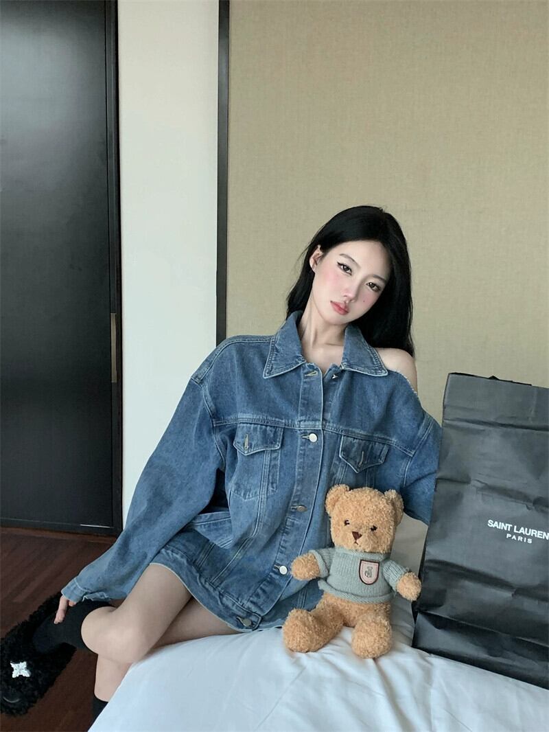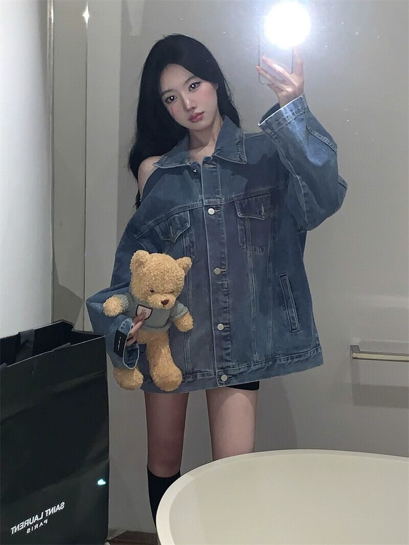 レトロデザインオフショルダー長袖デニムジャケットレディース2023春新作ルーズミッドレングスBFウィンドトップ ロング スプリング 春物 0921971467949418