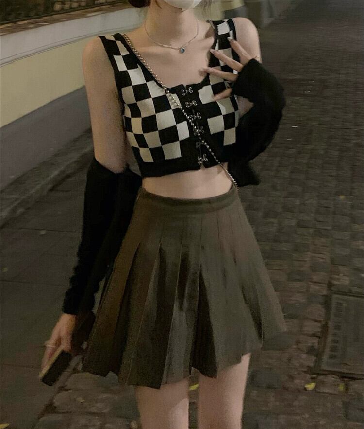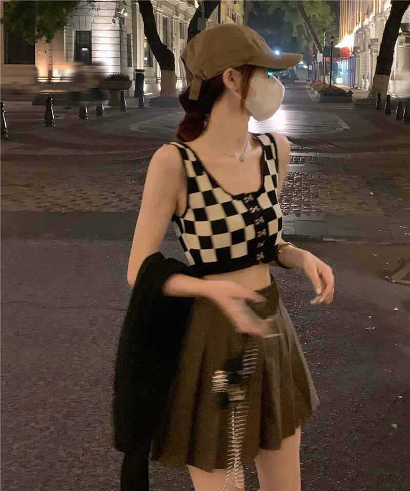 コントラストカラーのチェッカーボードキャミソール女性 2023 春の新しいスリムフィットと薄いショートノースリーブトップ 半袖 ハーフスリーブ スプリング 春物 0921932083559361