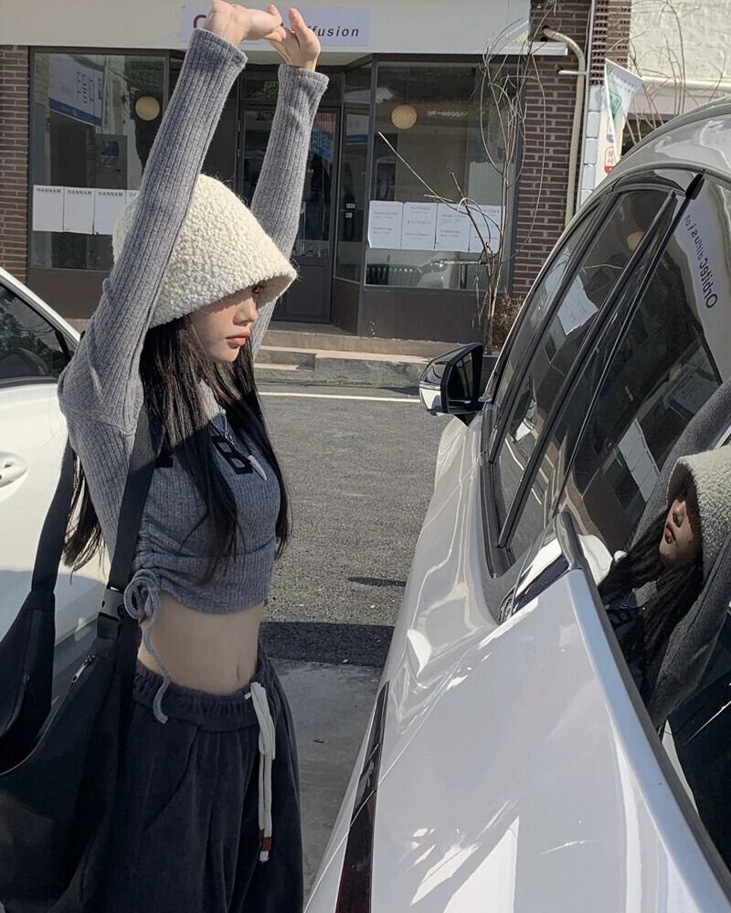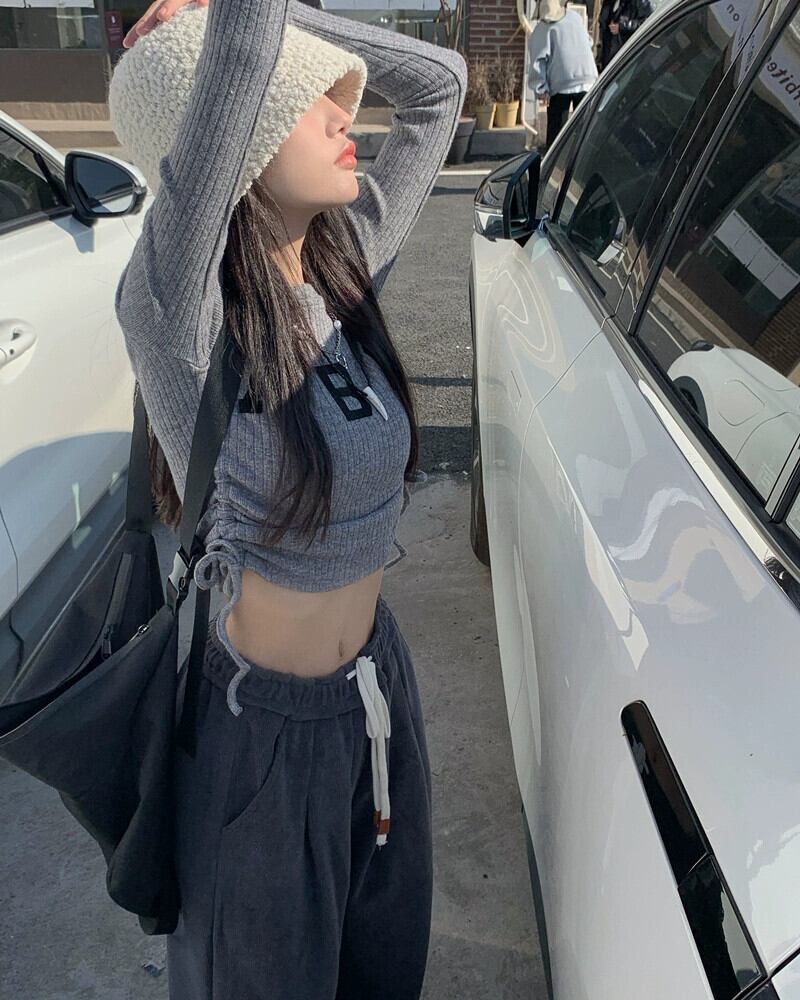 洋風レタープリントラウンドネック長袖Tシャツレディース2023春新作デザイン感覚巾着ウエスト痩身トップス ロング スプリング 春物 Oネック 092198684874372