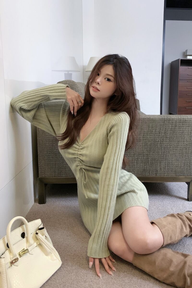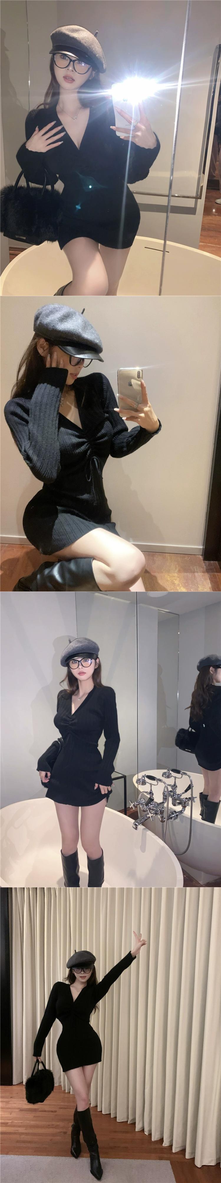 セクシーな V ネック巾着長袖ドレスの女性の春と秋 2023 新しいウエスト痩身ソリッドカラーニットスカート ロング スプリング 春物 オータム 秋物 Vネック 0921997264225731