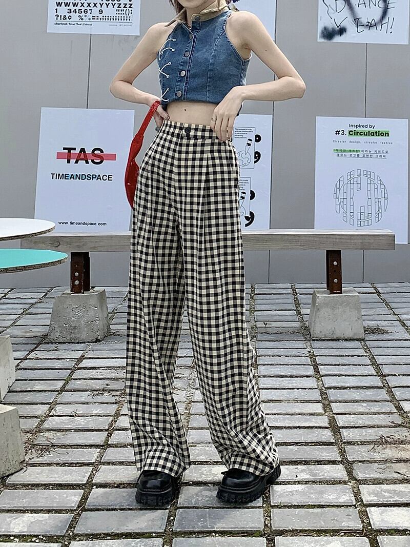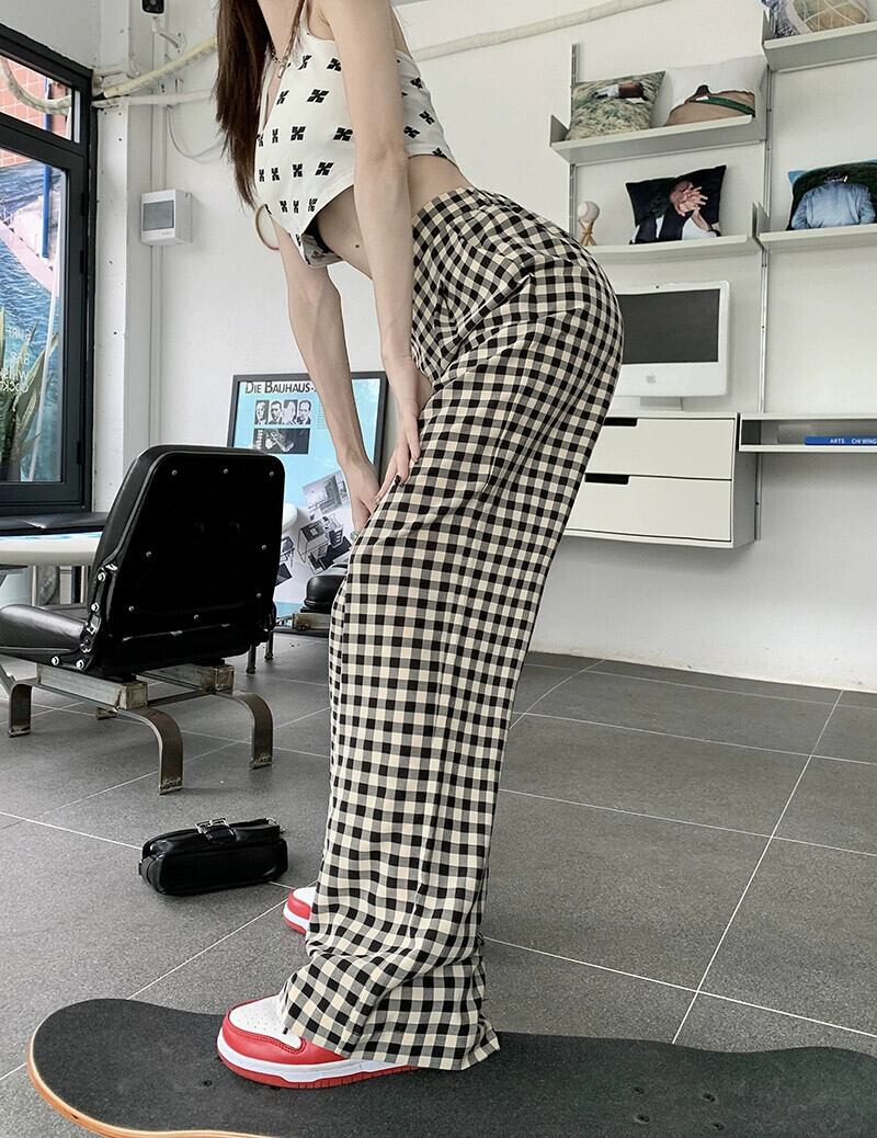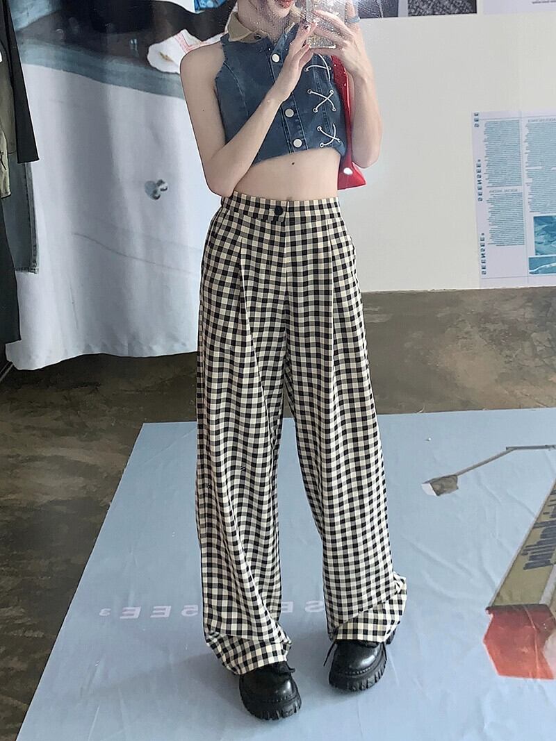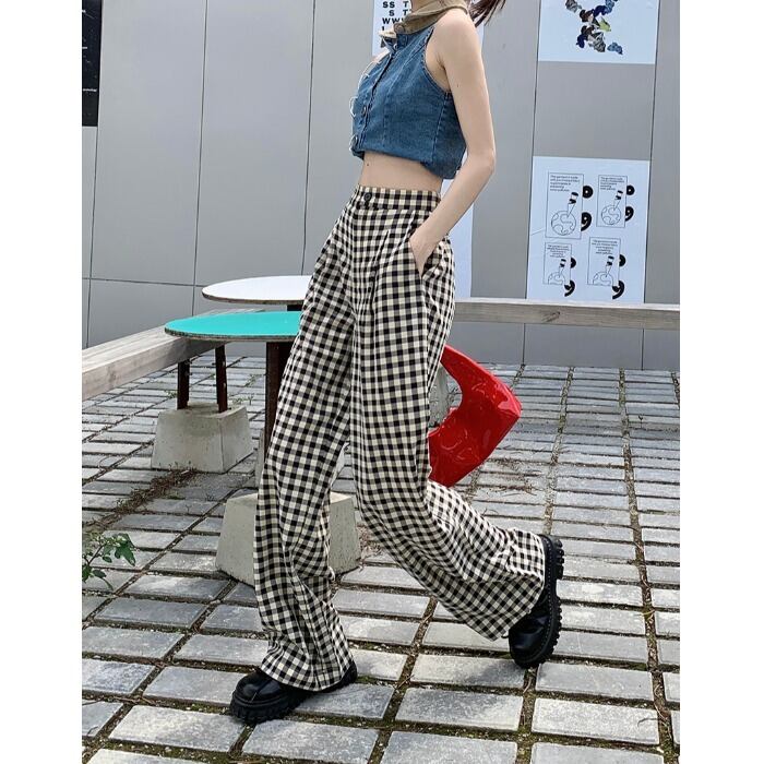 レトロチェック柄ウエストパンツ女性の夏 2023 ルーズストレートスリムスリムオールマッチモップパンツ サマー 夏物 0921992073248033