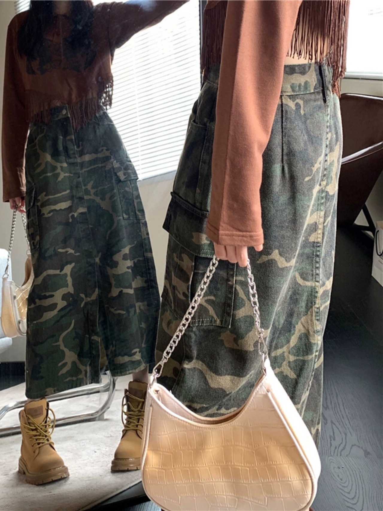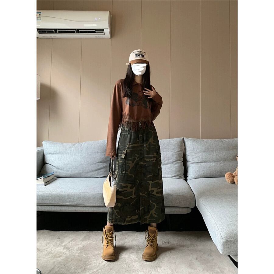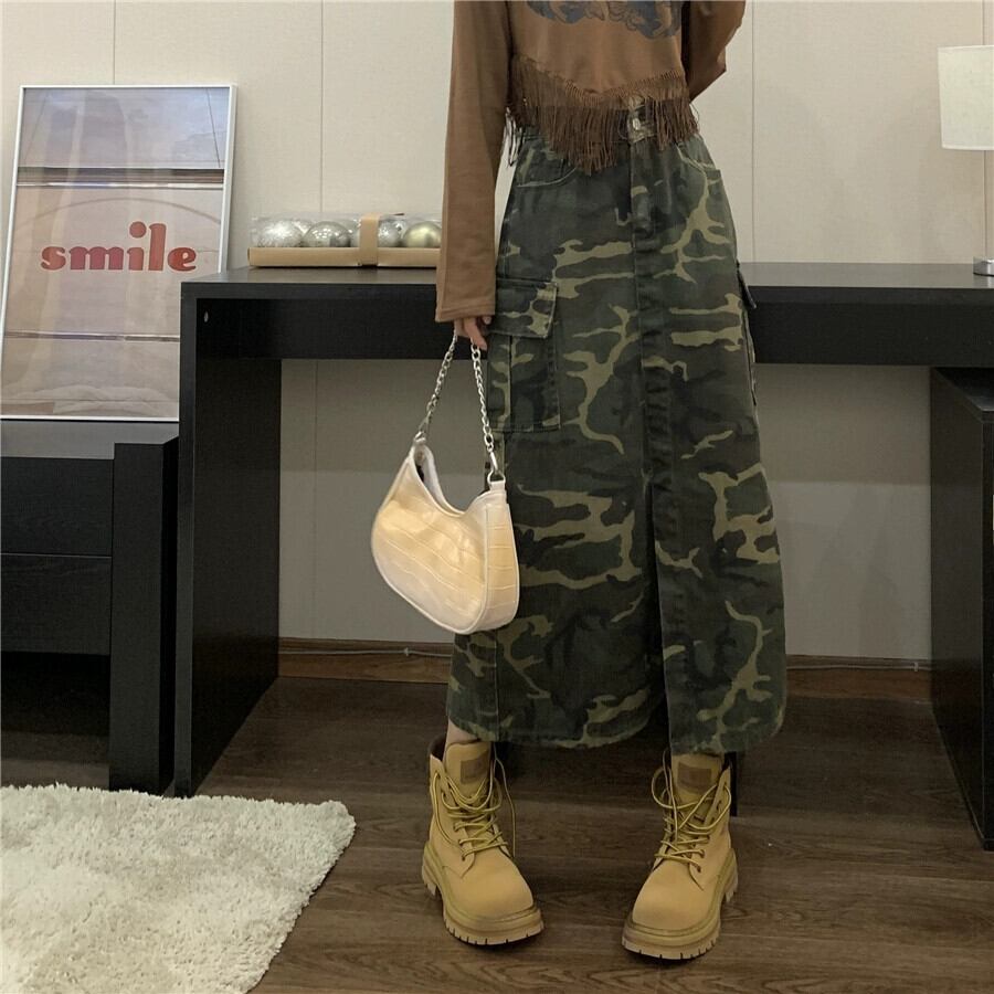 レトロ迷彩ハイウエストツーリングスカート女性の夏の 2023 新しいデザインセンススリット痩身オールマッチデニムスカート ハイウェスト サマー 夏物 0921937313075714