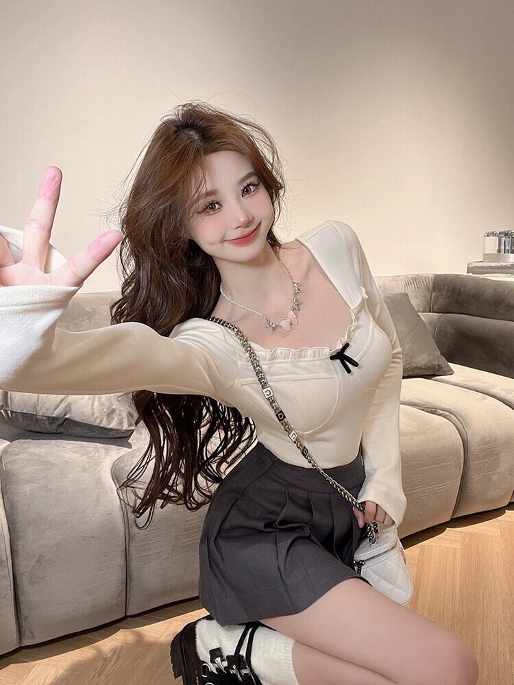 純粋な欲望風甘いレーススクエアカラー長袖 Tシャツ女性の冬 2023 新しい肥厚痩身薄い底トップ ロング 大人ガーリー スウィート キュート カジュアル ウィンター 冬物 スクウェア 0921949760330379