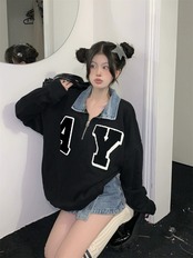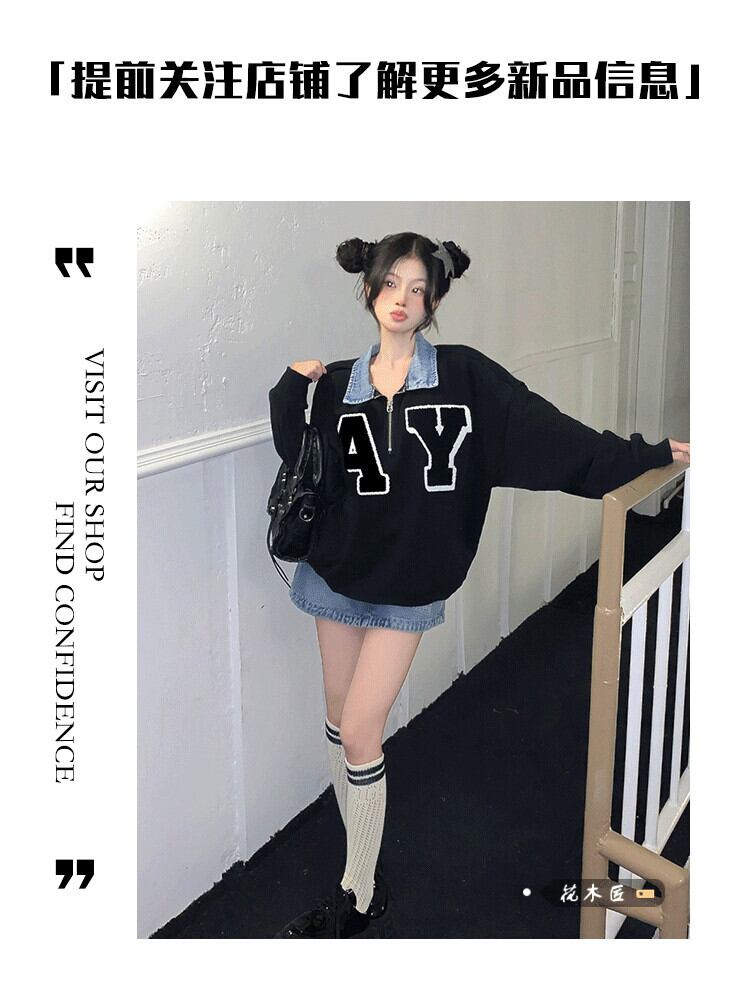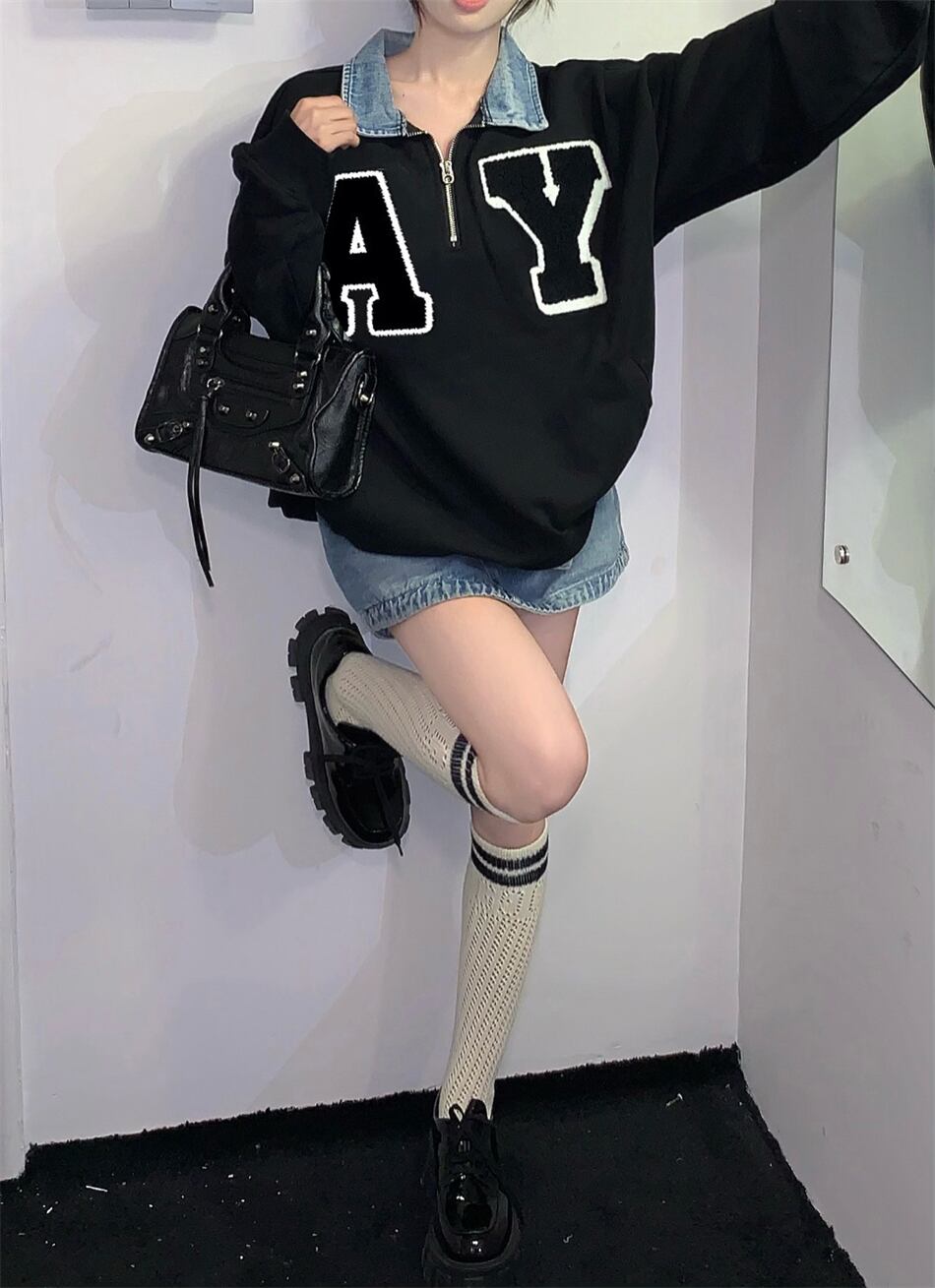 レター刺繍ポロカラーデニムステッチプルオーバーセーターレディース 2023 春の新作インオールマッチカップルトップス スプリング 春物 0921965684823387