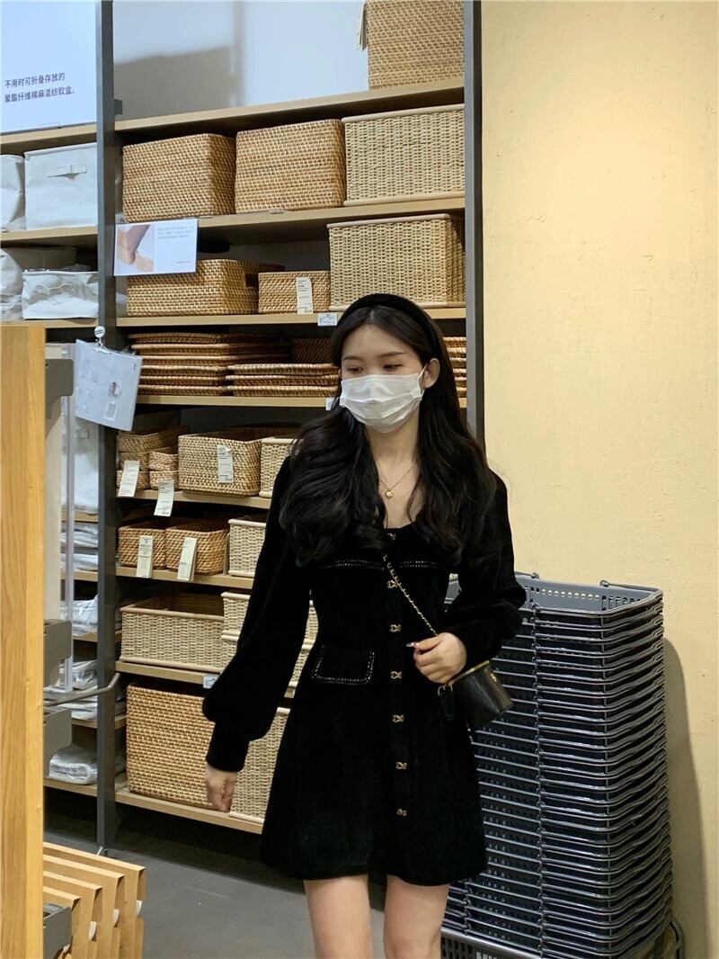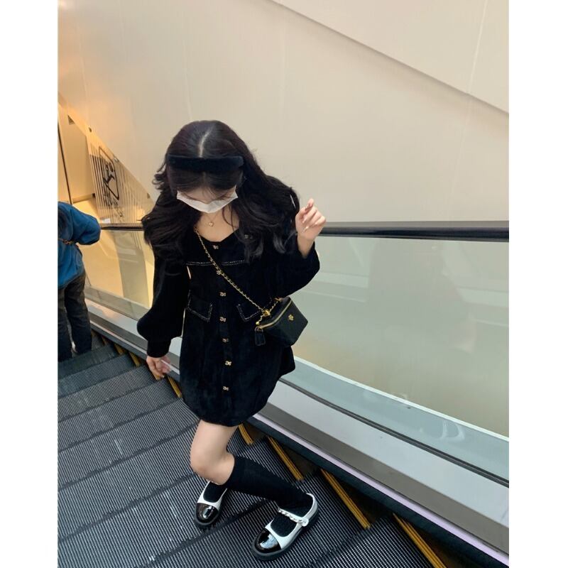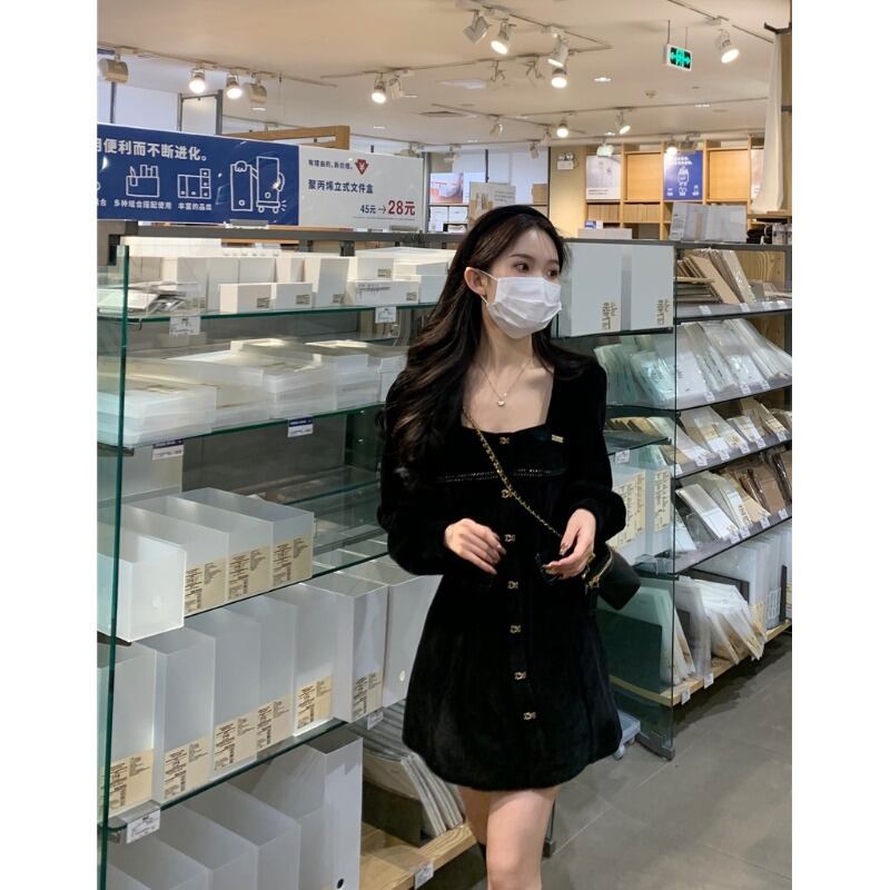気質黒ベルベットスクエアカラーコーデュロイドレス女性の春と秋の2023新しいスリムスリム長袖ショートスカート ロング ブラック スプリング 春物 オータム 秋物 スクウェア 0921920988517734