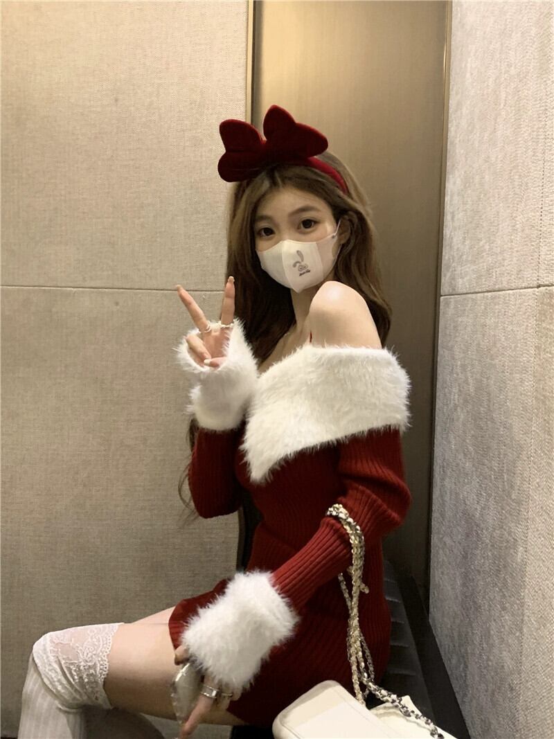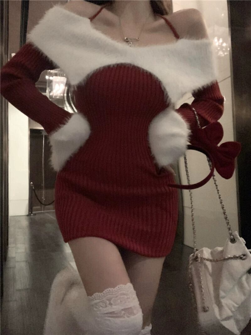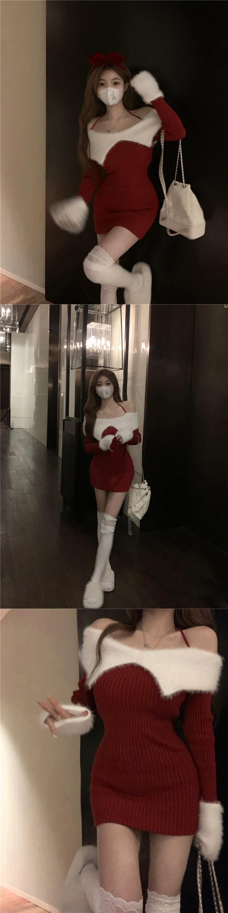 カラーマッチングホルターネック一言襟ニットセーター長袖ドレス女性春と秋 2023 新しいスリムセーターヒップスカートトレンディな ロング スプリング 春物 オータム 秋物 0921934215656068