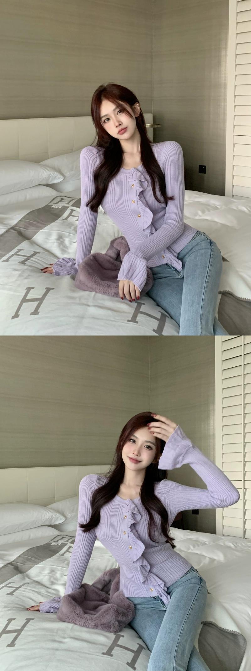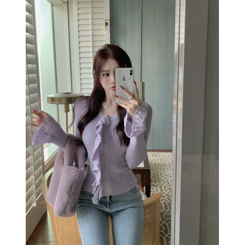 ロマンチック木耳サイドマイクロトランペットスリーブショートセーターレディース2023春新作オールマッチスリムスリム長袖トップ ロング スプリング 春物 0921919488823210