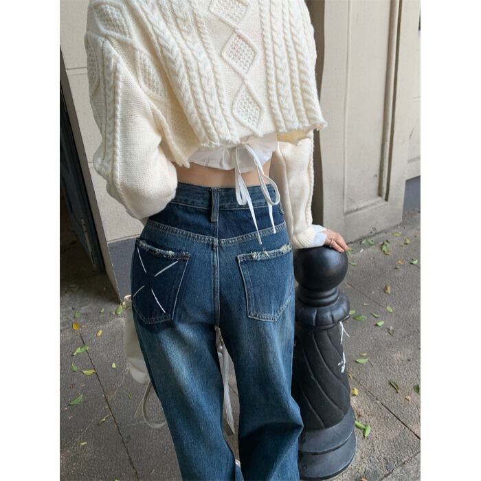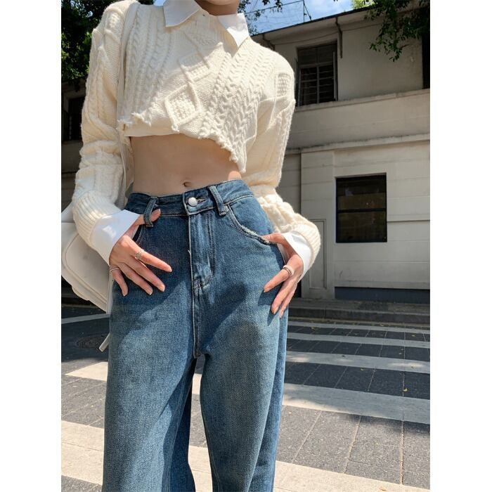 センスルーズカラーマッチングジーンズ女性の2023夏の新しいハイウエスト薄いオールマッチストレートワイドレッグモップパンツ ハイウェスト サマー 夏物 0921940854875216