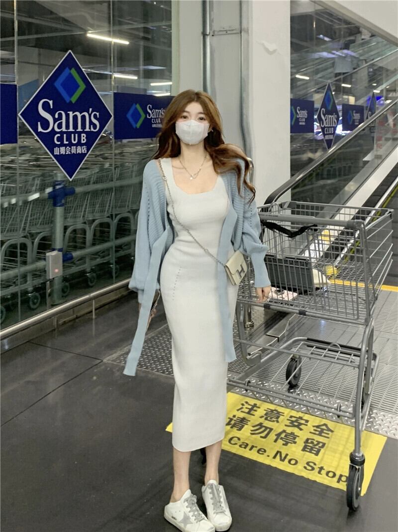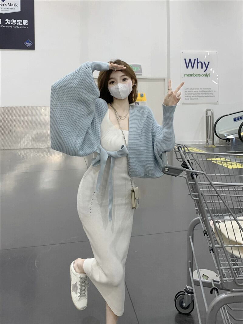 色:ブルーカーディガンワンピース,ホワイトニットスカート