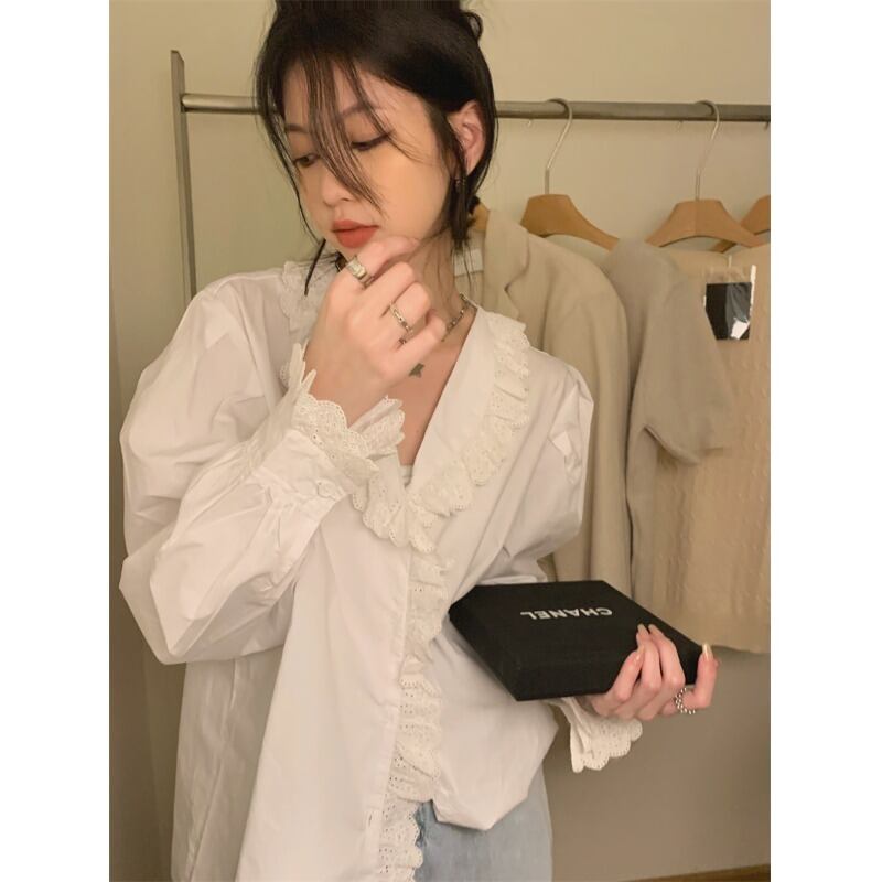 フレンチ V ネックレース白シャツ女性の夏の長袖シャツ気質ゆったりと多用途のカーディガントップ ロング ホワイト サマー 夏物 Vネック 0921963467187542