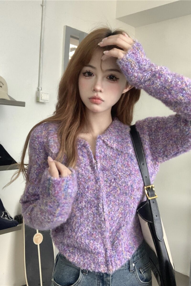 多彩なデザインのソフトワックスカラーコントラストセータージャケット女性の冬 2023 新しいスリムフィットショートポロカラーカーディガン ウィンター 冬物 0921996545712366
