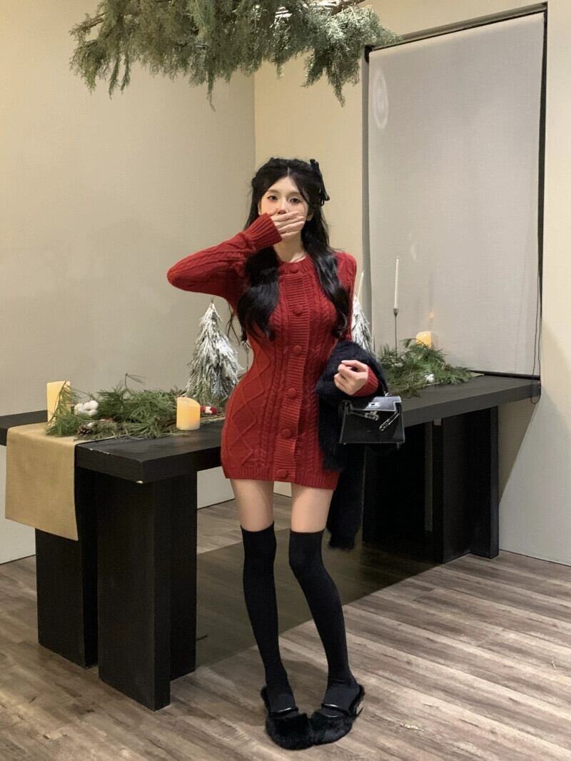 大気レッドニットセータードレス女性の春と秋の新しい自己修養ボトミングバッグヒップスカートショートスカートスカート スプリング 春物 オータム 秋物 0921972837329670